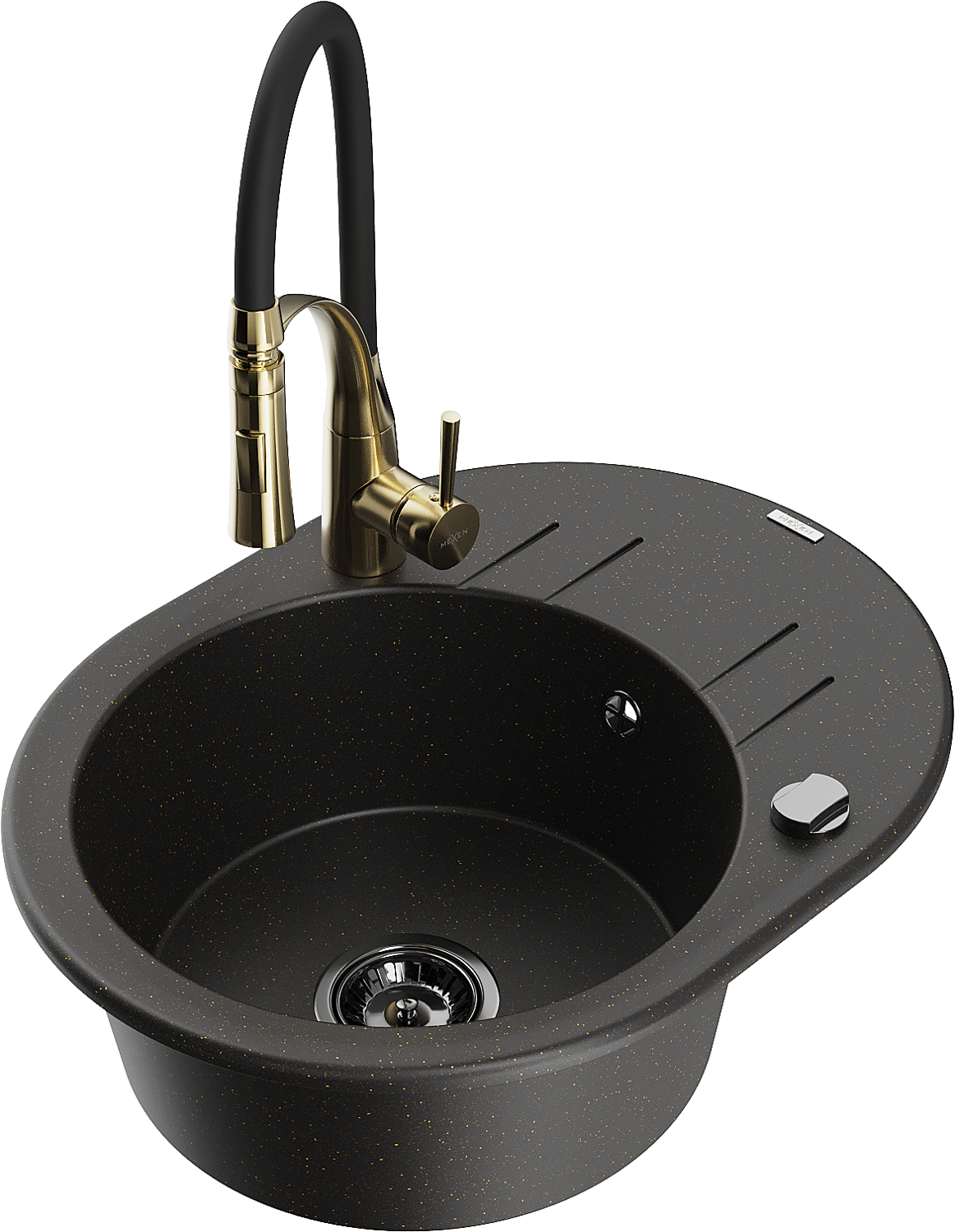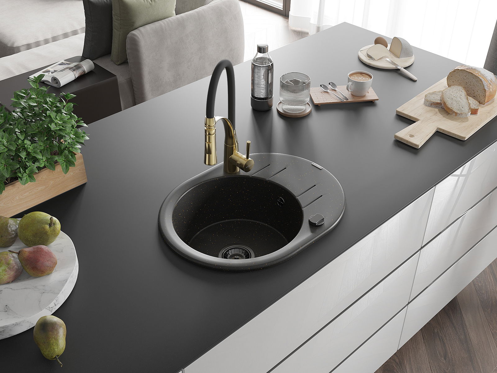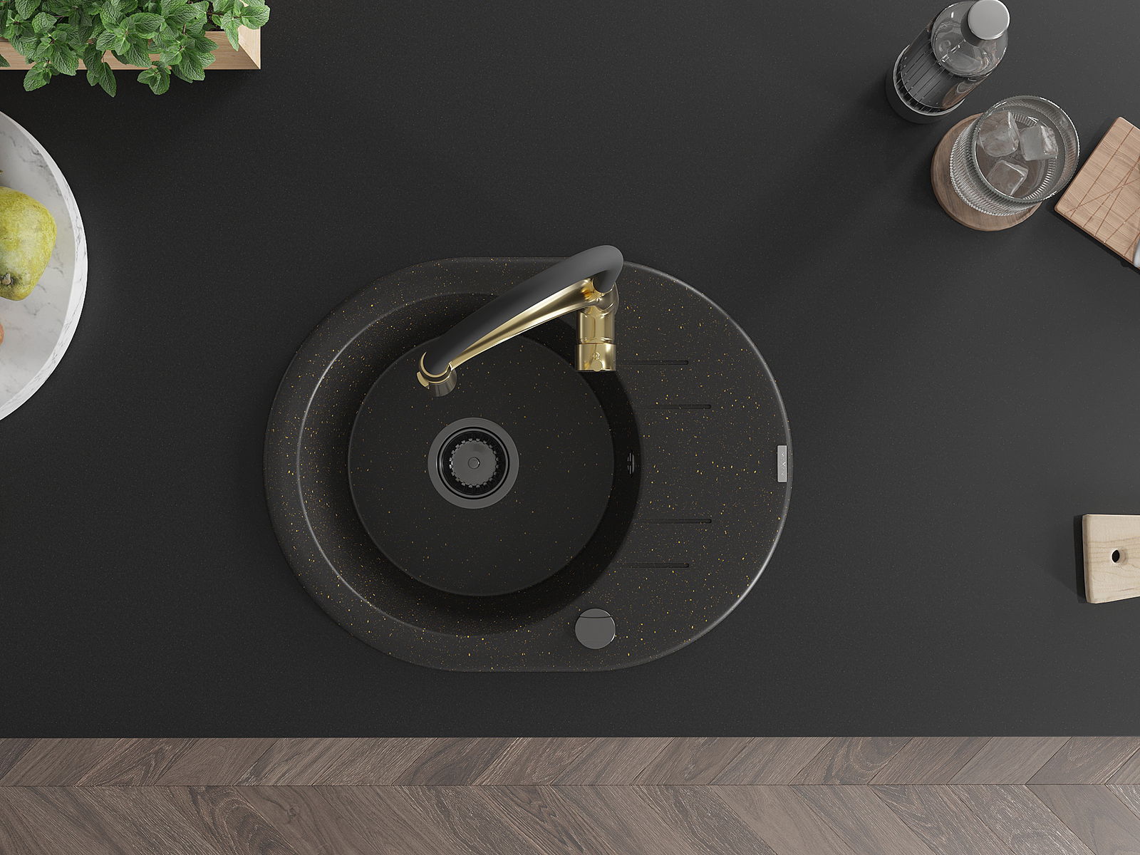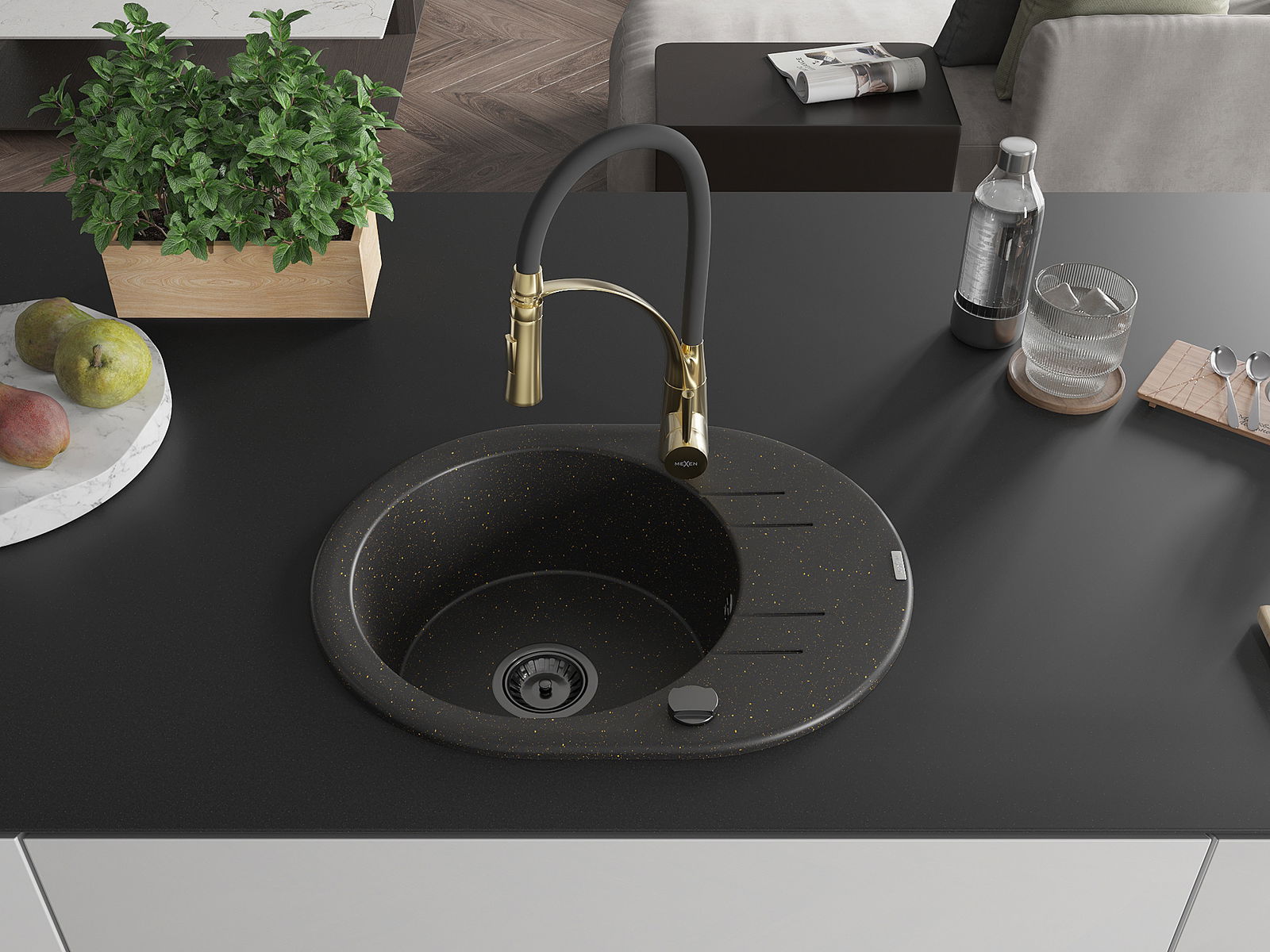Mexen Kevin zlewozmywak granitowy 1-komorowy z ociekaczem i baterią kuchenną Aster, czarny/złoty metalik - 6517-75-73450-57-B
