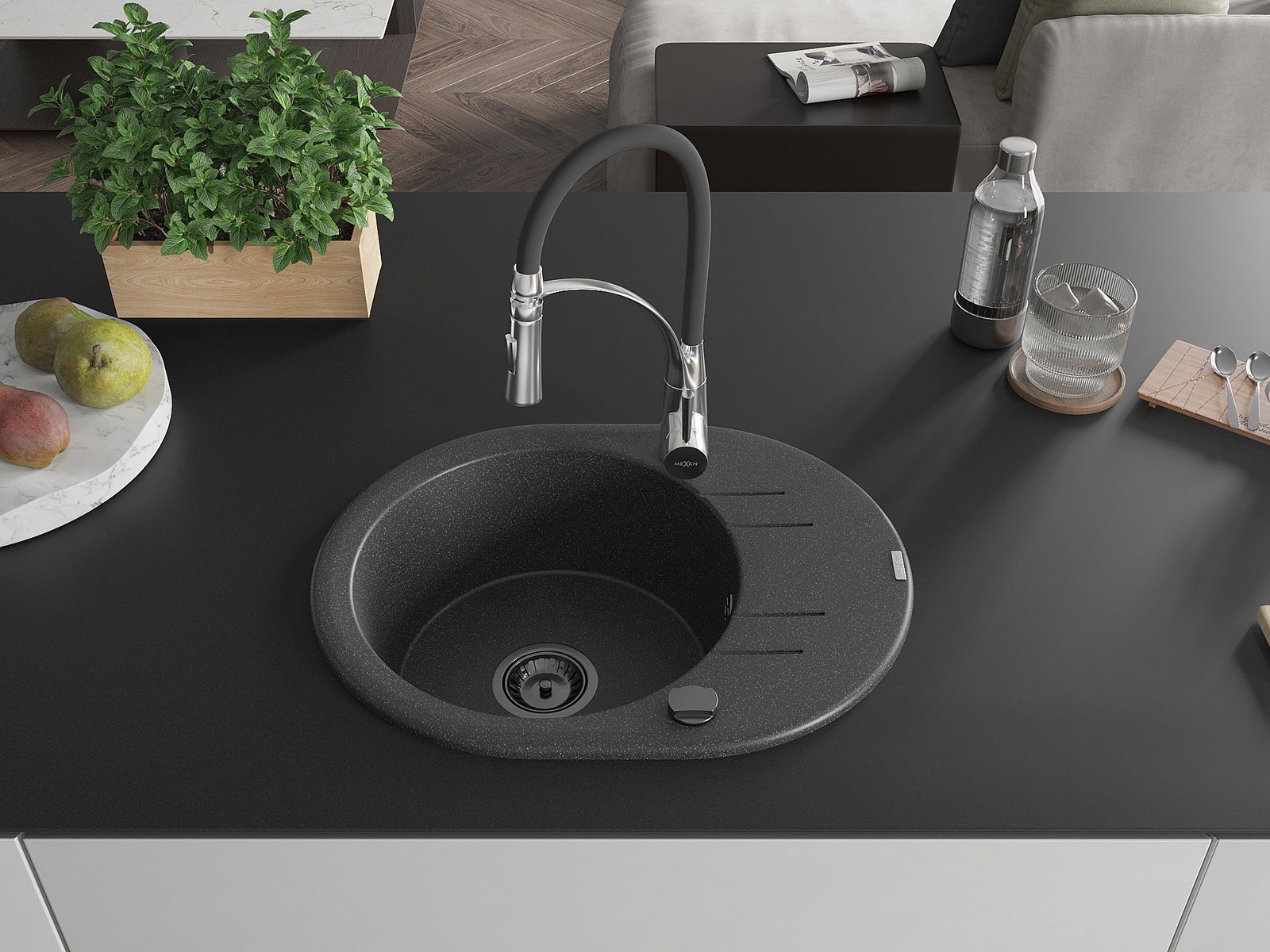 Mexen Kevin zlewozmywak granitowy 1-komorowy z ociekaczem i baterią kuchenną Aster, czarny nakrapiany - 6517-76-73450-07-B