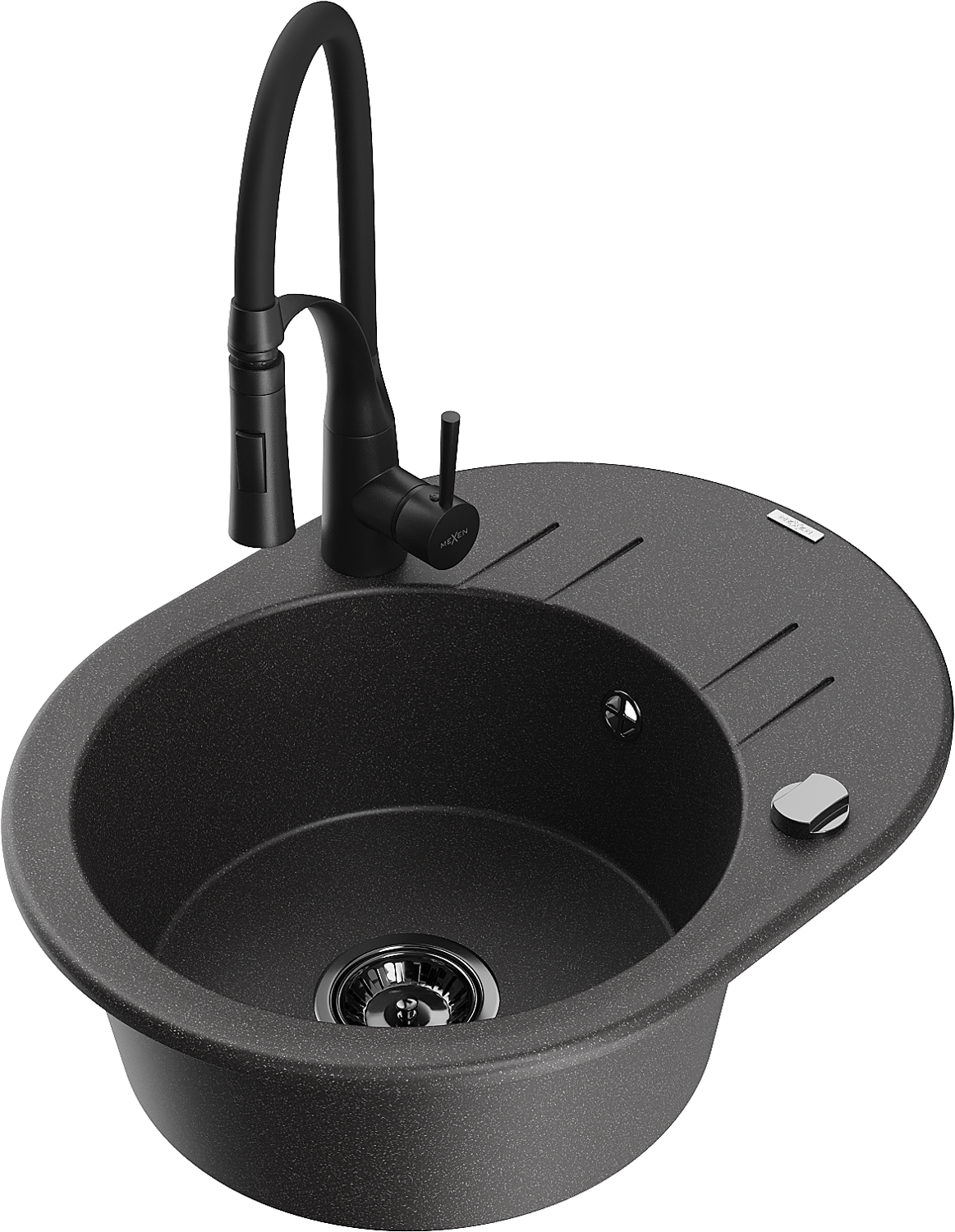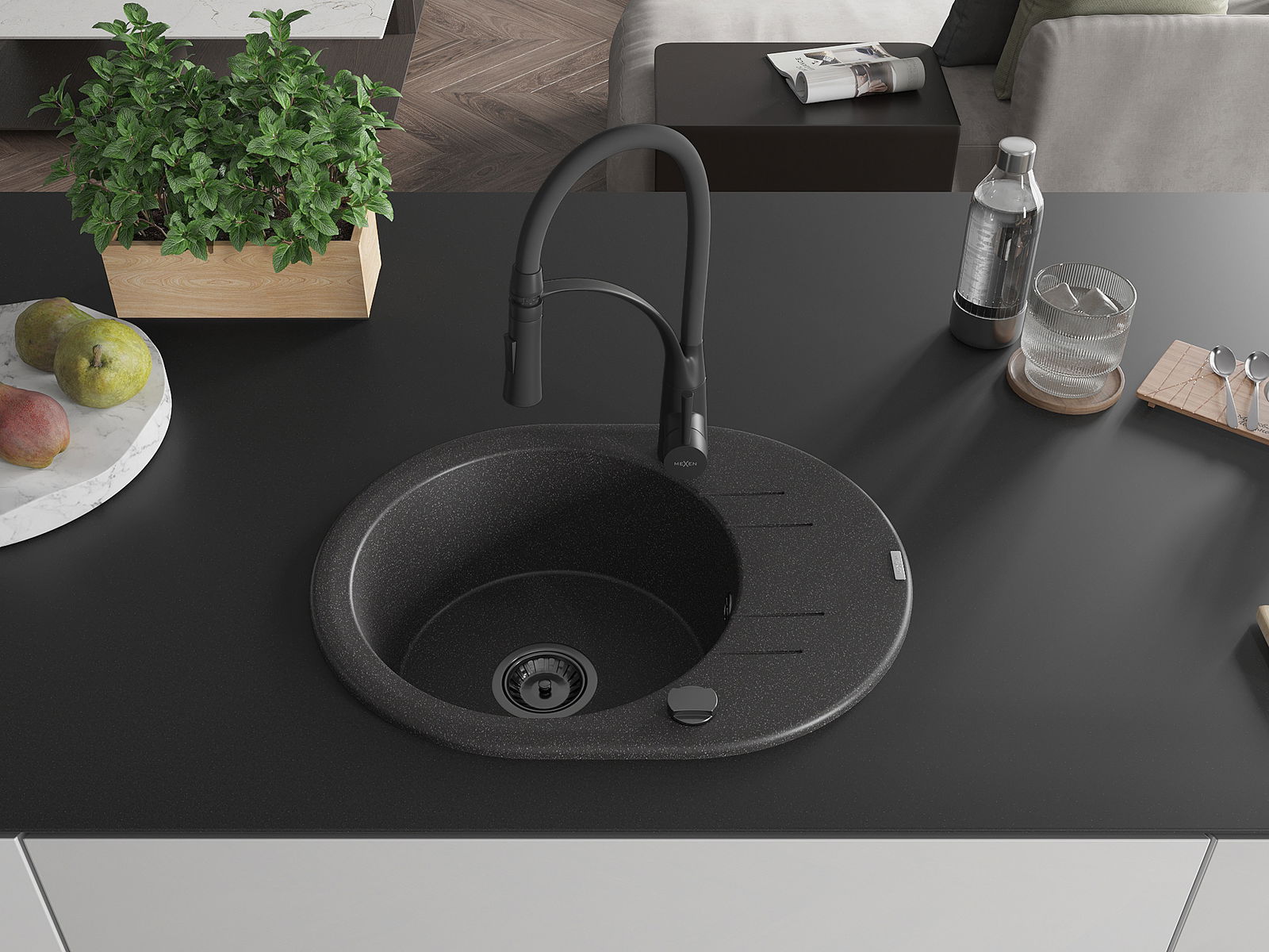 Mexen Kevin zlewozmywak granitowy 1-komorowy z ociekaczem i baterią kuchenną Aster, czarny nakrapiany - 6517-76-73450-70-B