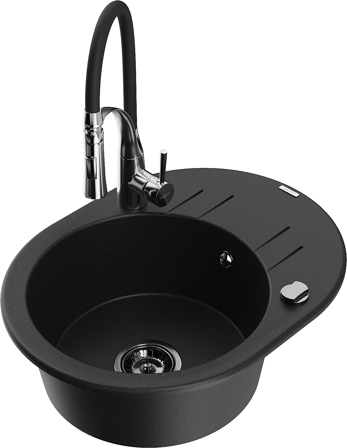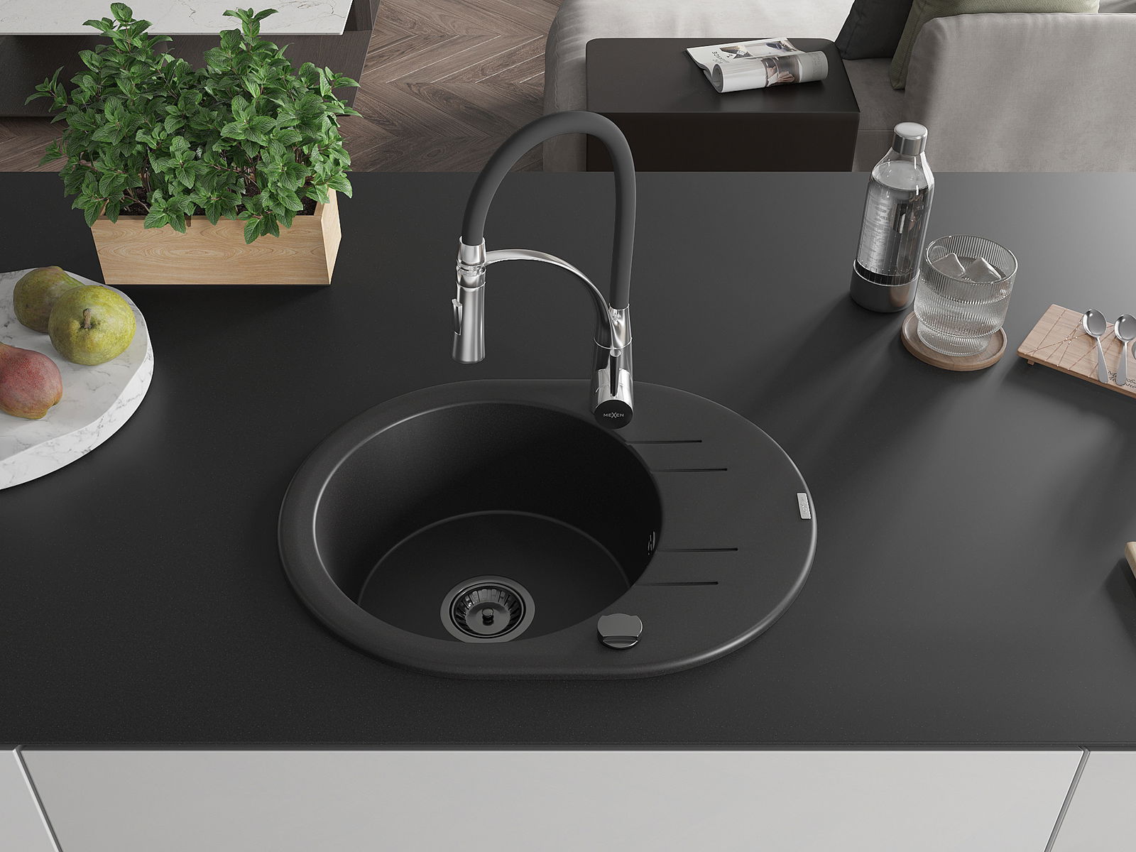 Mexen Kevin zlewozmywak granitowy 1-komorowy z ociekaczem i baterią kuchenną Aster, czarny - 6517-77-73450-07-B