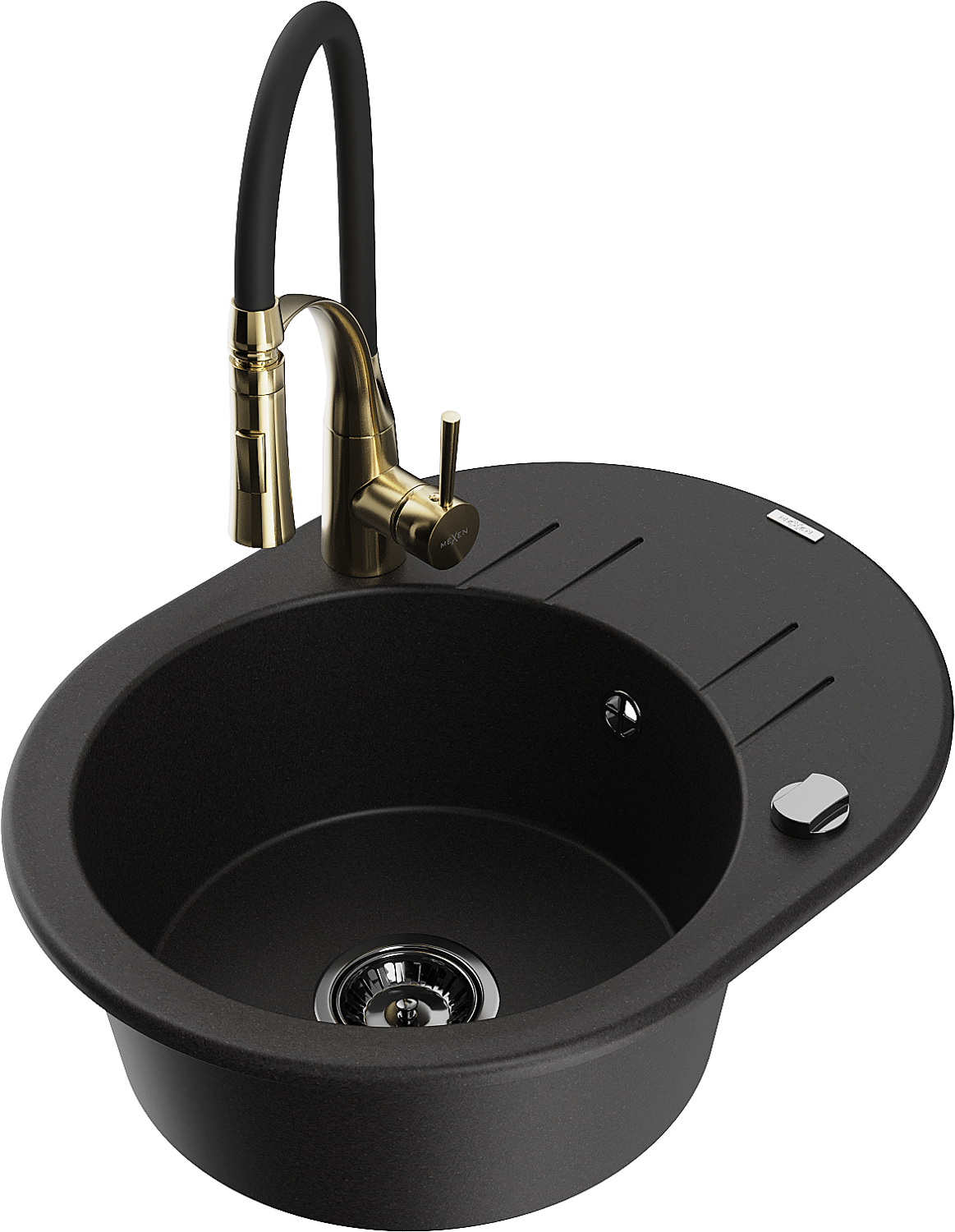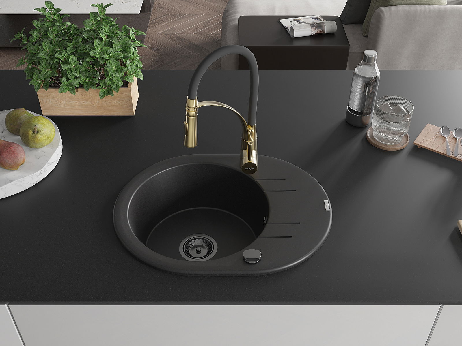 Mexen Kevin zlewozmywak granitowy 1-komorowy z ociekaczem i baterią kuchenną Aster, czarny - 6517-77-73450-57-B