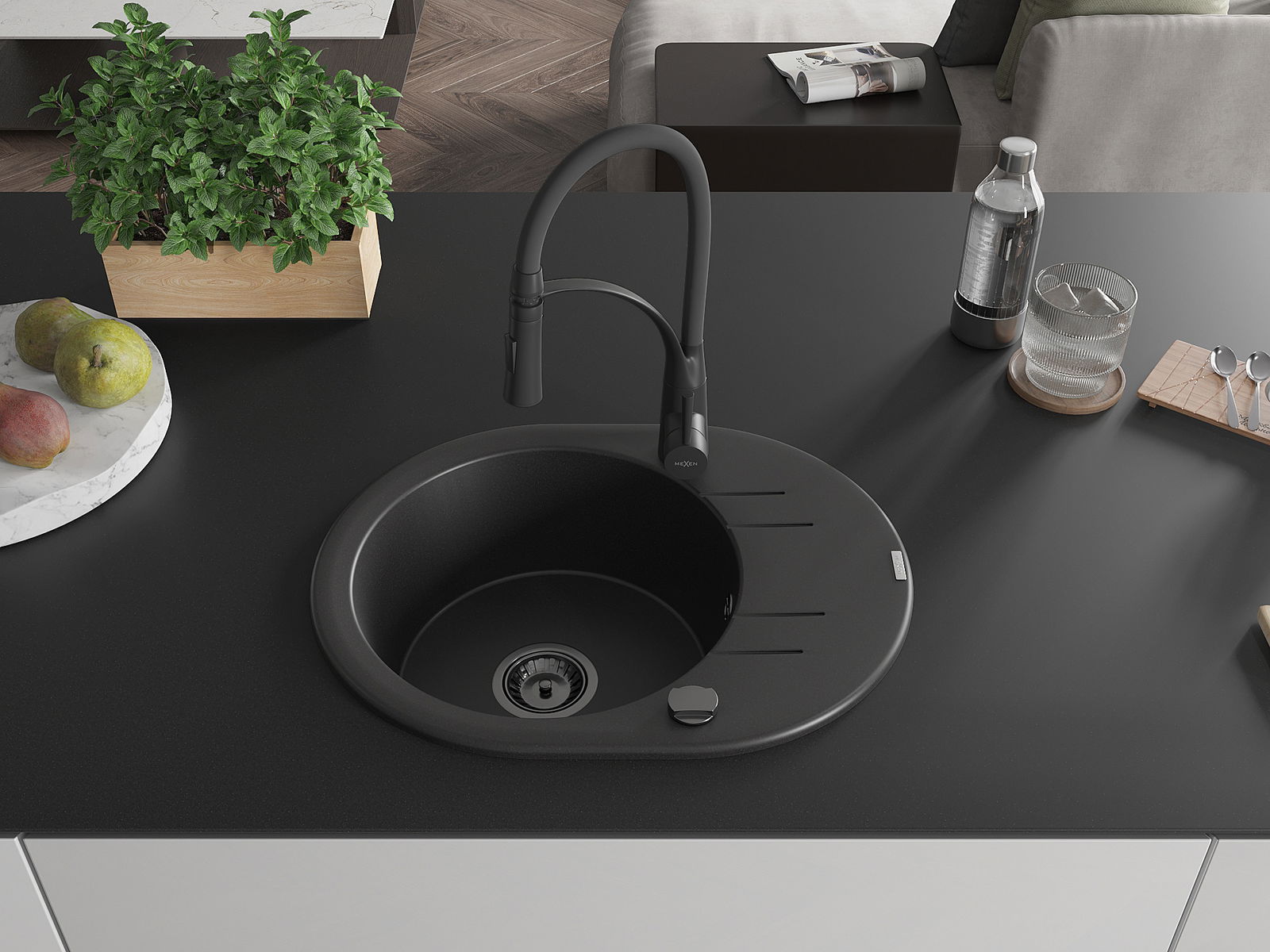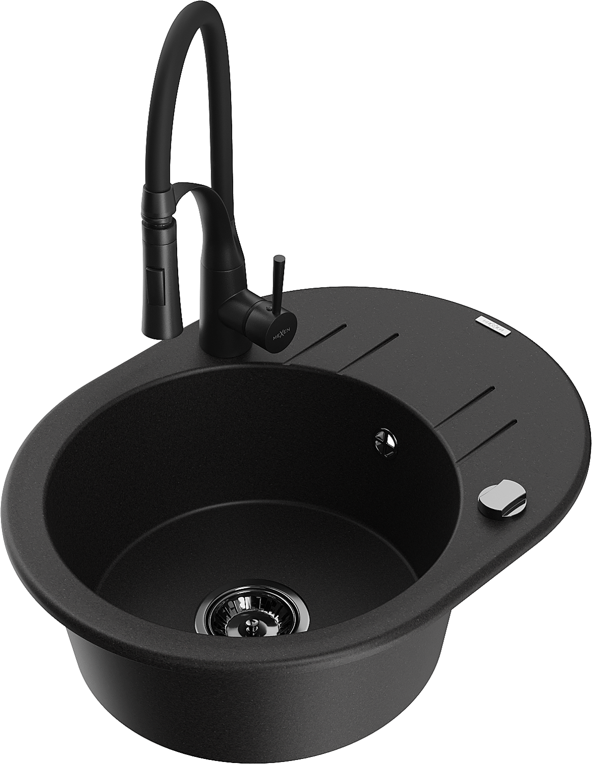 Mexen Kevin zlewozmywak granitowy 1-komorowy z ociekaczem i baterią kuchenną Aster, czarny - 6517-77-73450-70-B