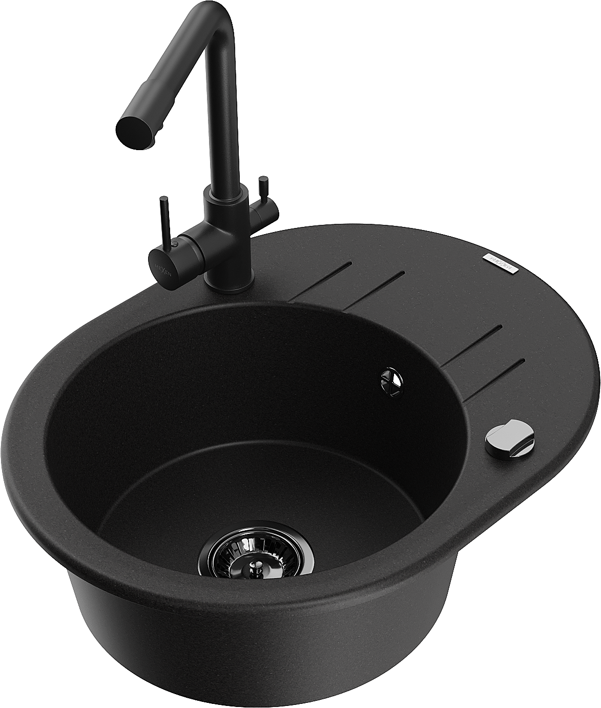 Mexen Kevin zlewozmywak granitowy 1-komorowy z ociekaczem i baterią kuchenną Duero, czarny - 6517-77-671600-70-B
