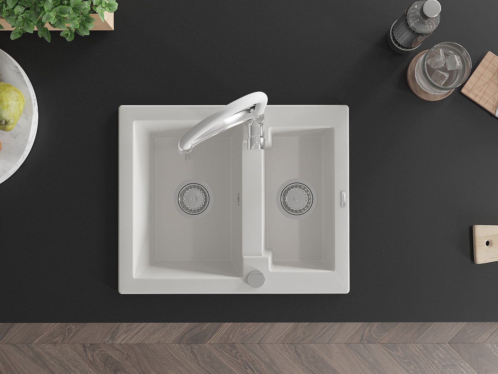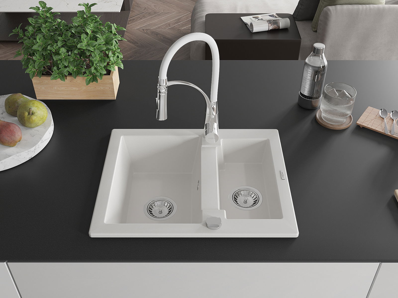 Mexen Carlos zlewozmywak granitowy 1,5-komorowy z baterią kuchenną Aster, biały - 6518-20-73450-02