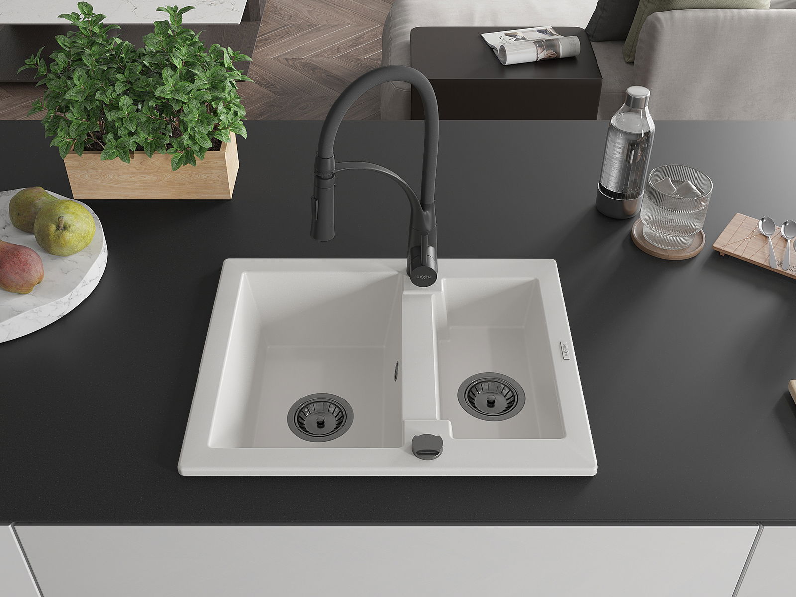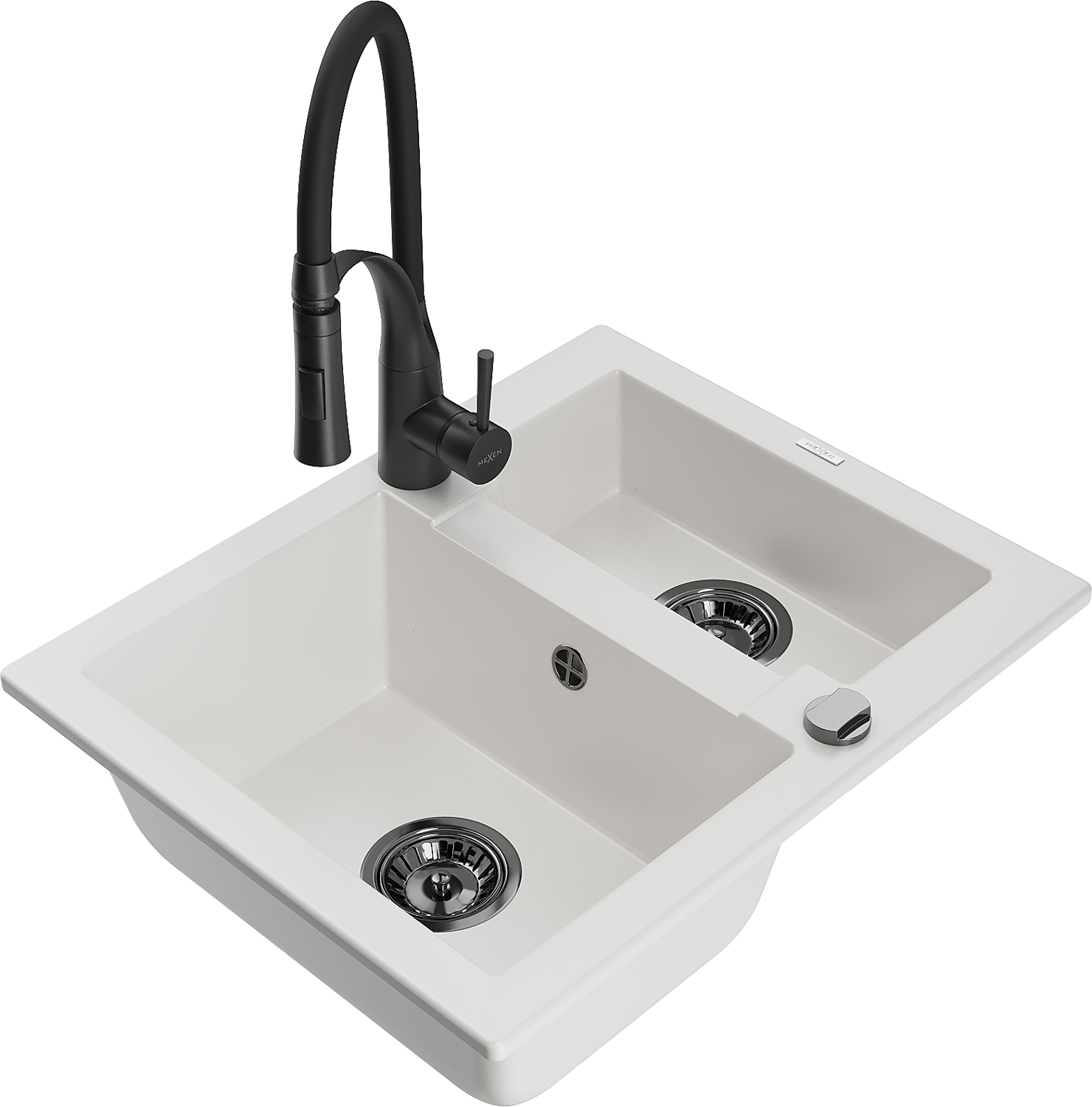 Mexen Carlos zlewozmywak granitowy 1,5-komorowy z baterią kuchenną Aster, biały - 6518-20-73450-70-B