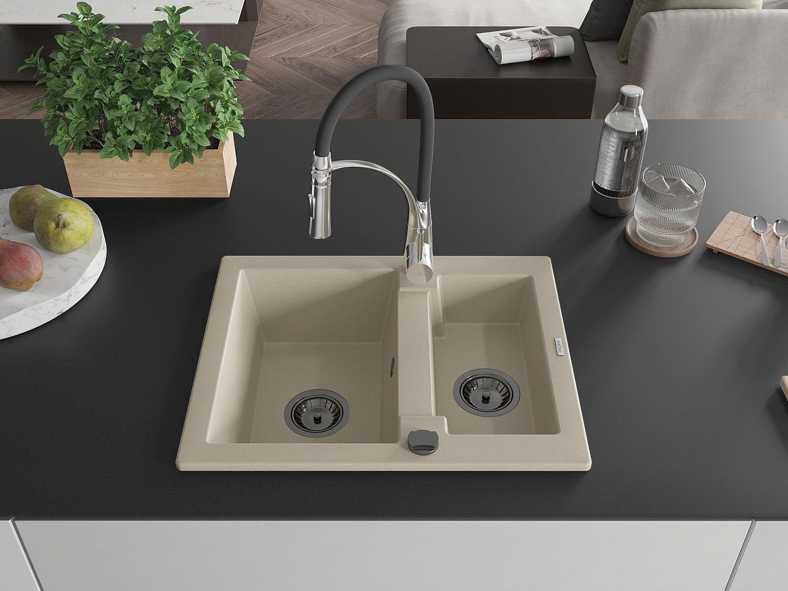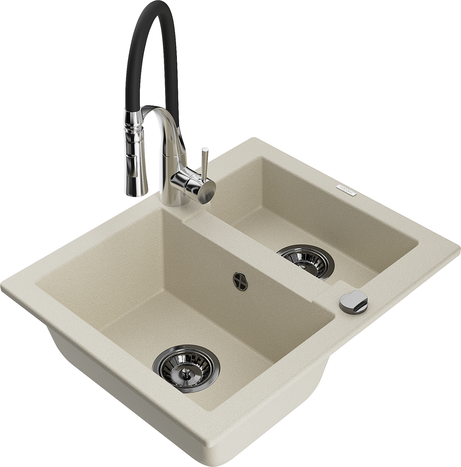 Mexen Carlos zlewozmywak granitowy 1,5-komorowy z baterią kuchenną Aster, beżowy - 6518-69-73450-07-B