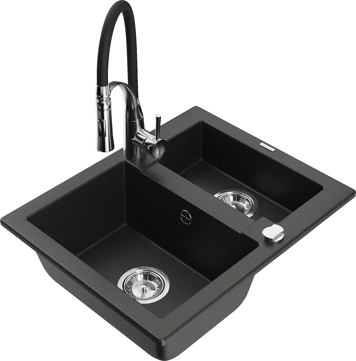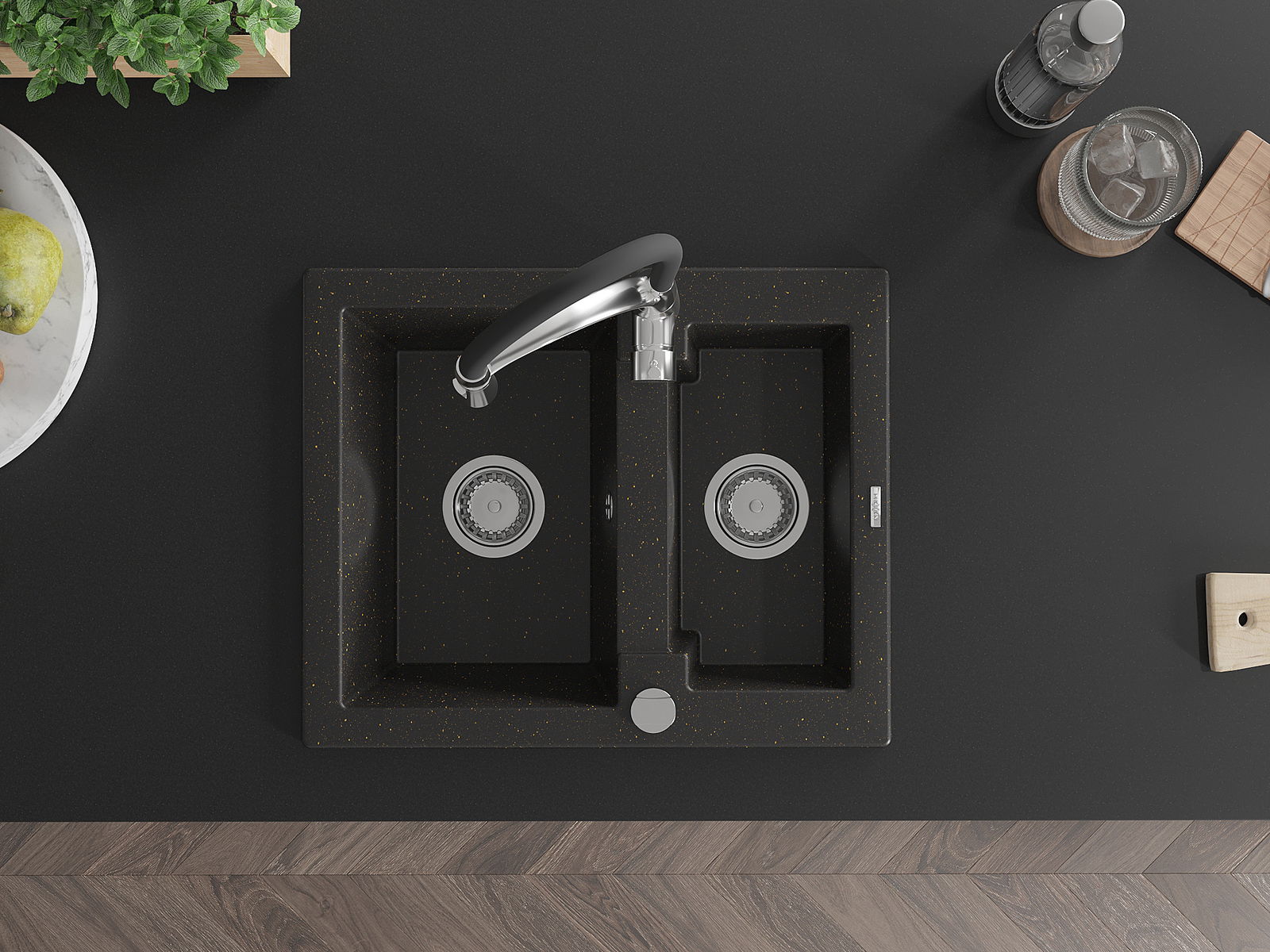 Mexen Carlos zlewozmywak granitowy 1,5-komorowy z baterią kuchenną Aster, czarny/złoty metalik - 6518-75-73450-07