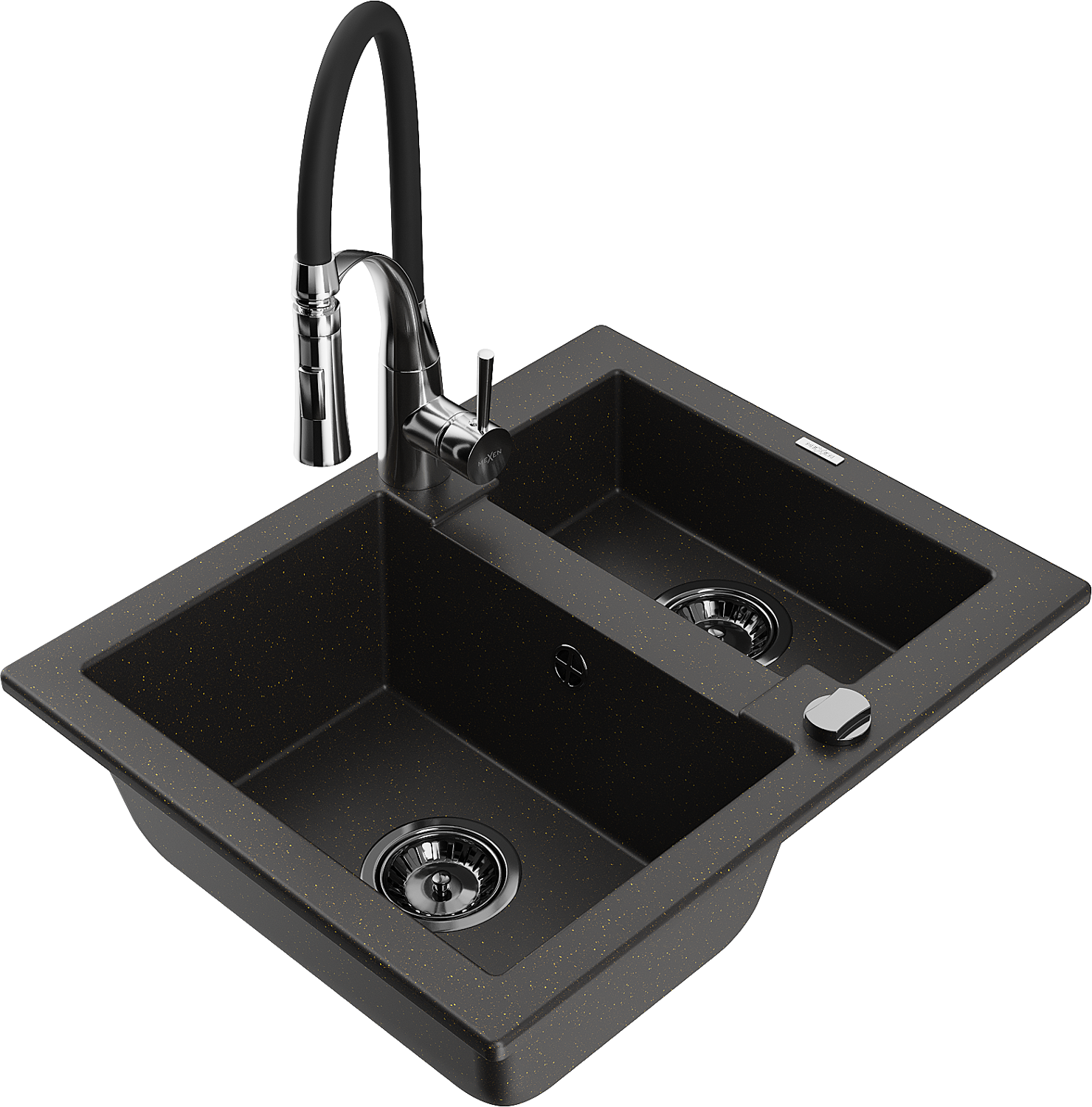 Mexen Carlos zlewozmywak granitowy 1,5-komorowy z baterią kuchenną Aster, czarny/złoty metalik - 6518-75-73450-07-B