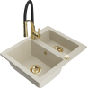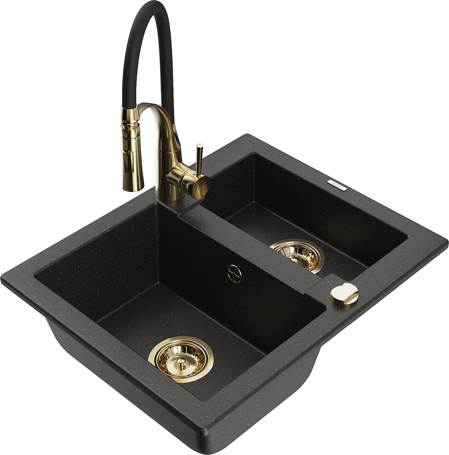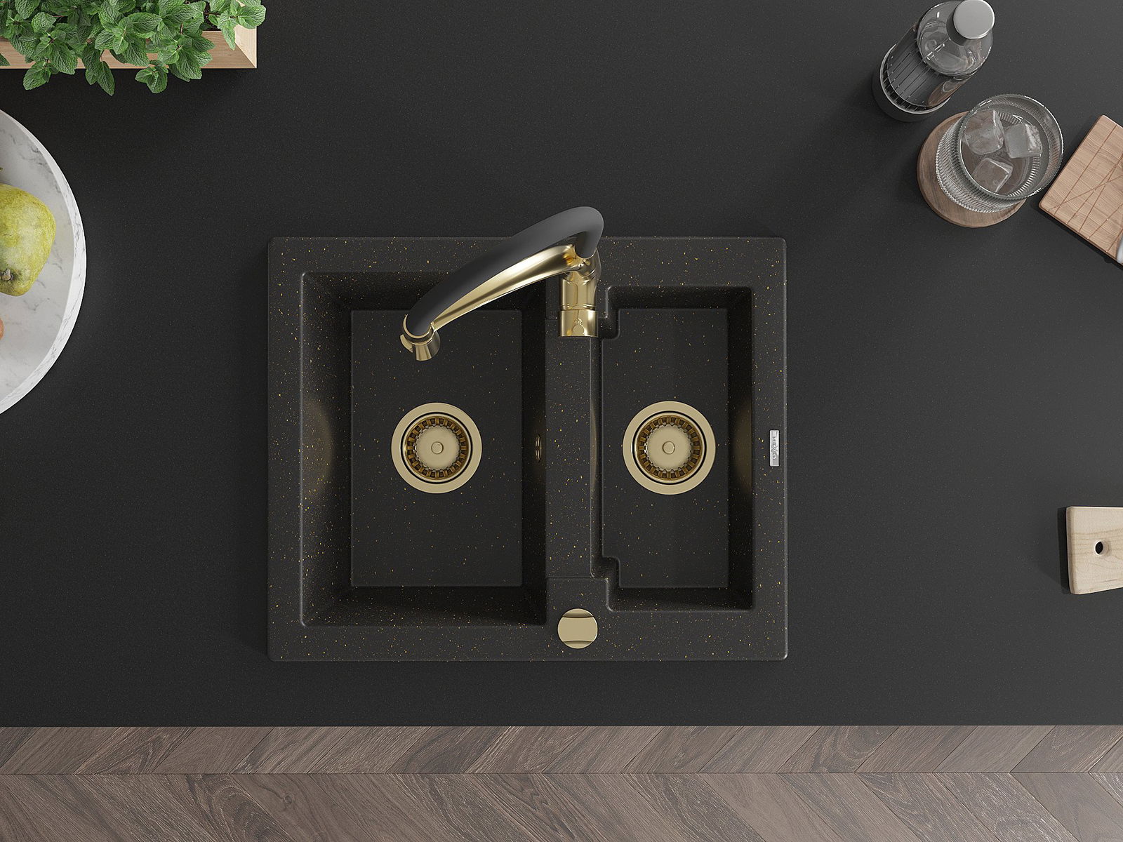 Mexen Carlos zlewozmywak granitowy 1,5-komorowy z baterią kuchenną Aster, czarny/złoty metalik - 6518-75-73450-57-G