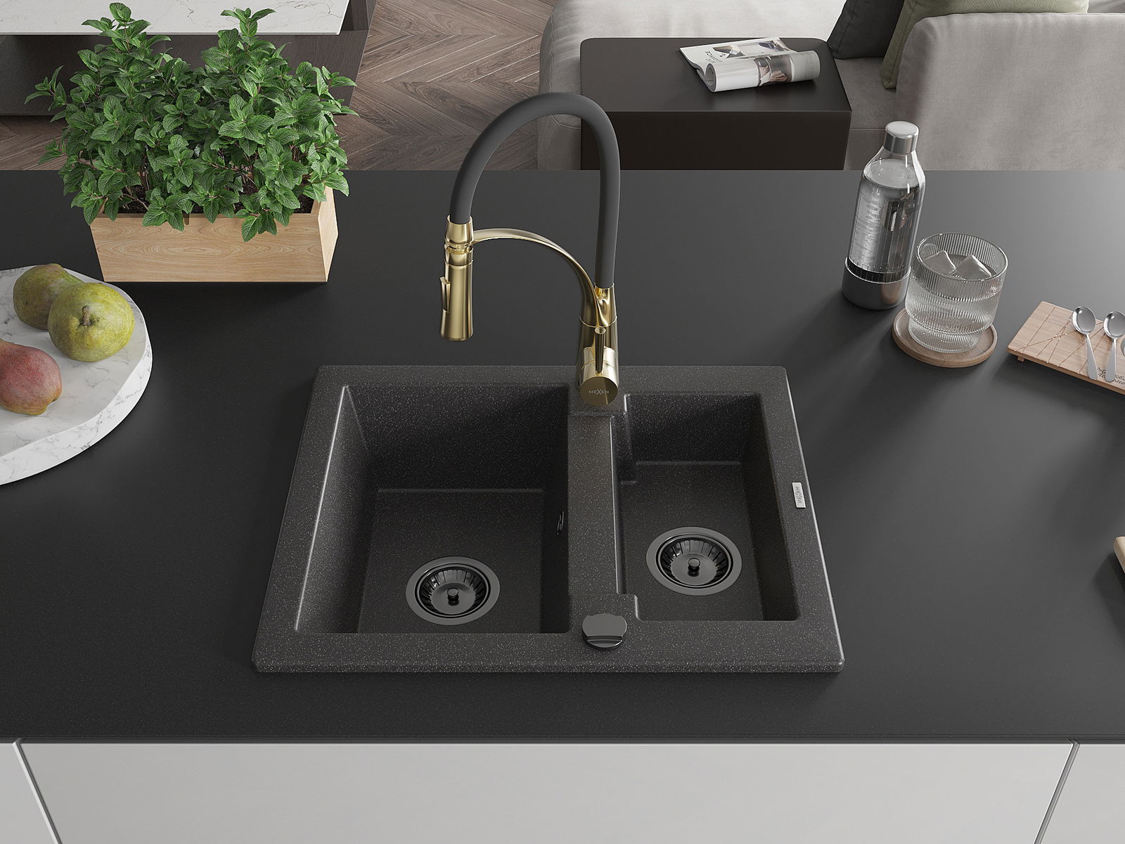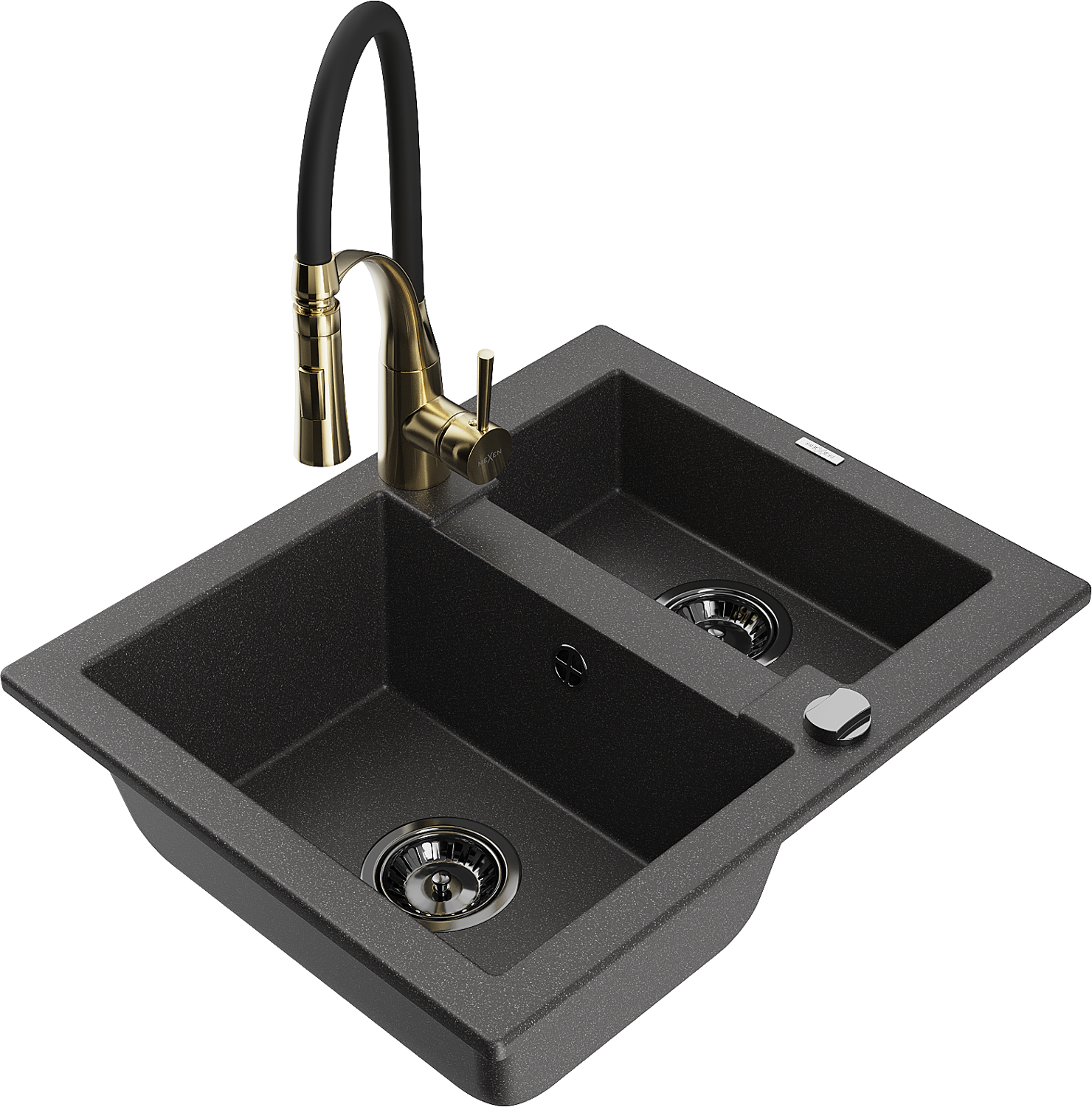 Mexen Carlos zlewozmywak granitowy 1,5-komorowy z baterią kuchenną Aster, czarny nakrapiany - 6518-76-73450-57-B