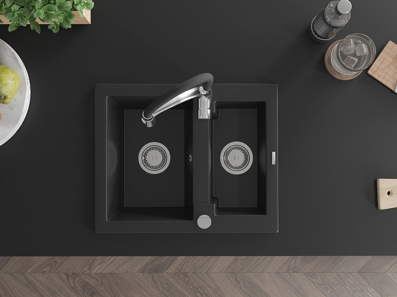 Mexen Carlos zlewozmywak granitowy 1,5-komorowy z baterią kuchenną Aster, czarny - 6518-77-73450-07