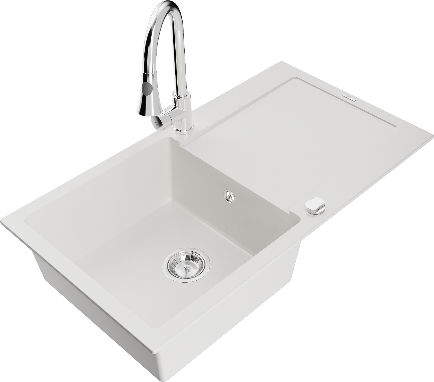 Mexen Leo zlewozmywak granitowy 1-komorowy z ociekaczem i baterią kuchenną Elia, biały - 6501-20-670101-00