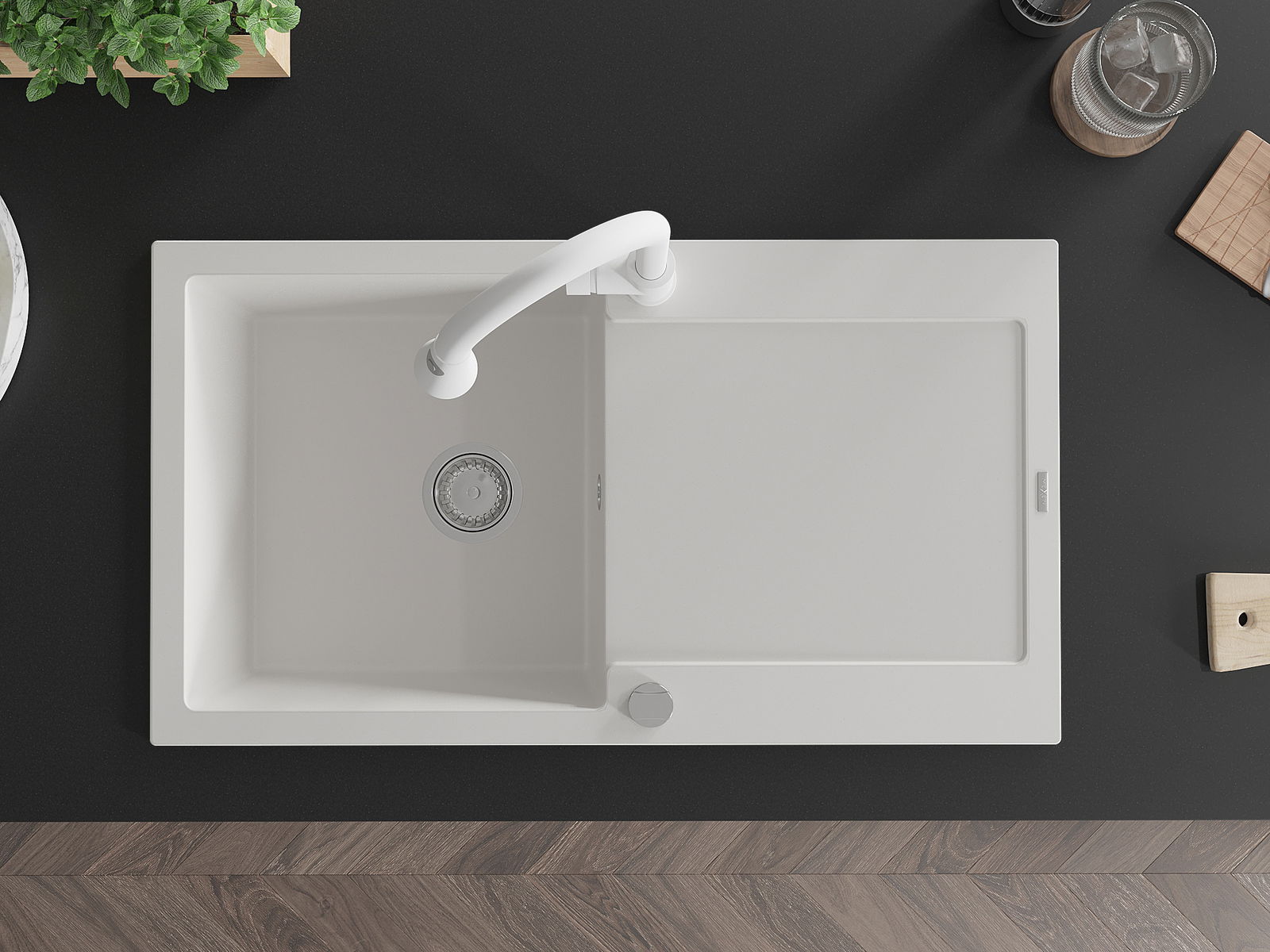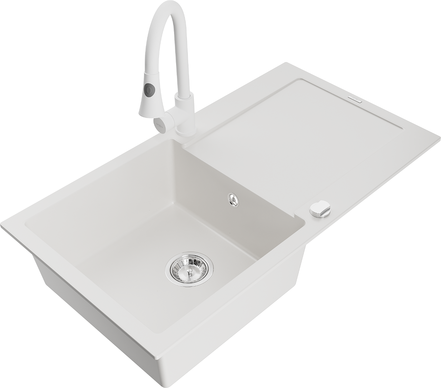 Mexen Leo zlewozmywak granitowy 1-komorowy z ociekaczem i baterią kuchenną Elia, biały - 6501-20-670101-20