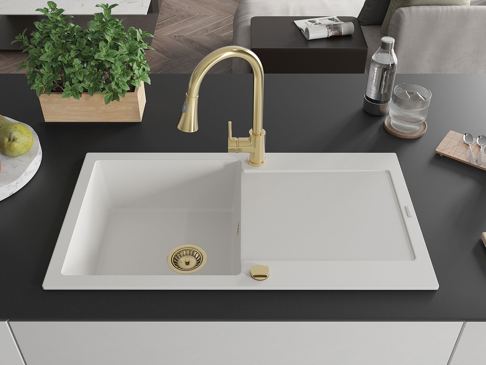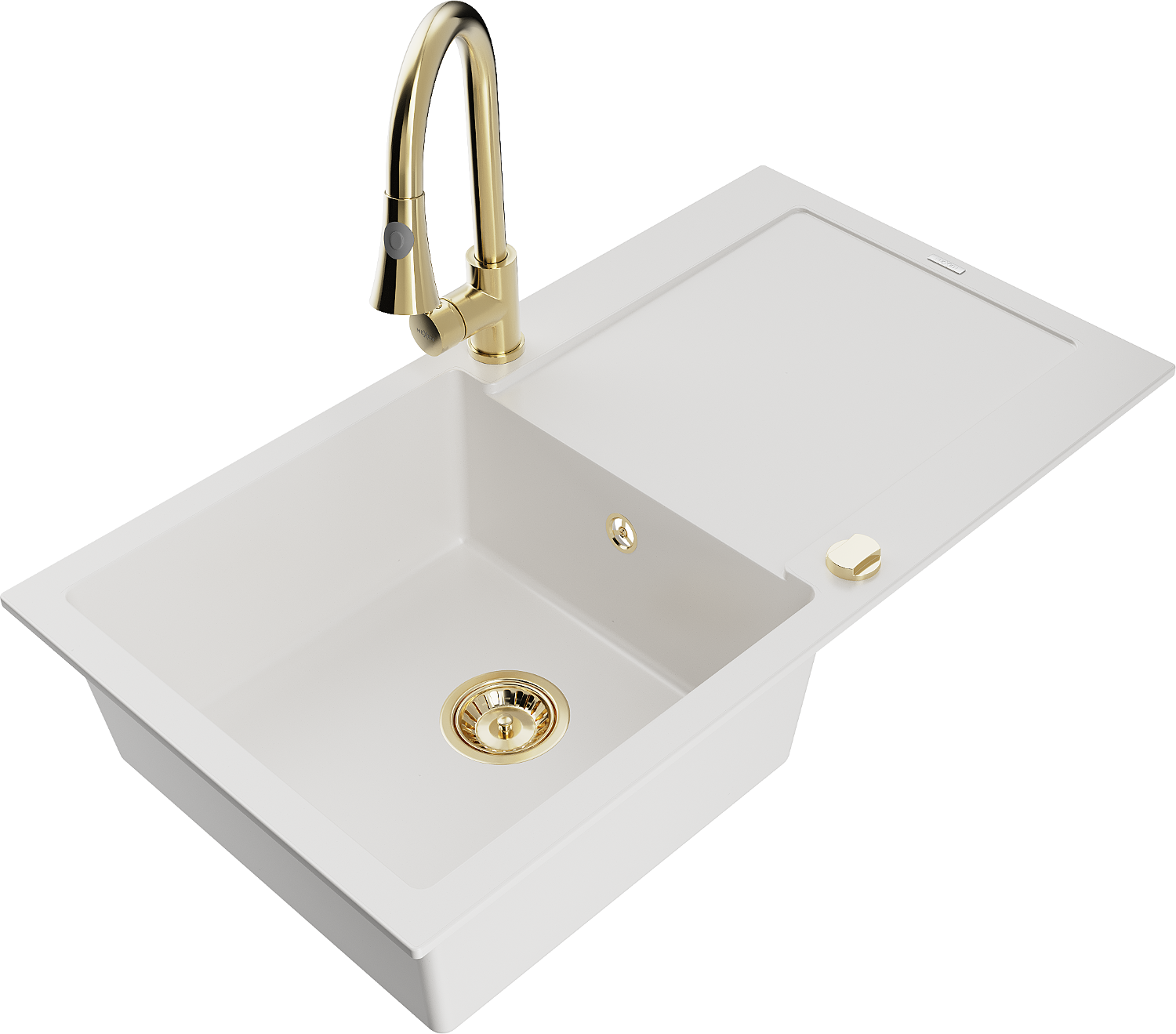 Mexen Leo zlewozmywak granitowy 1-komorowy z ociekaczem i baterią kuchenną Elia, biały - 6501-20-670101-50