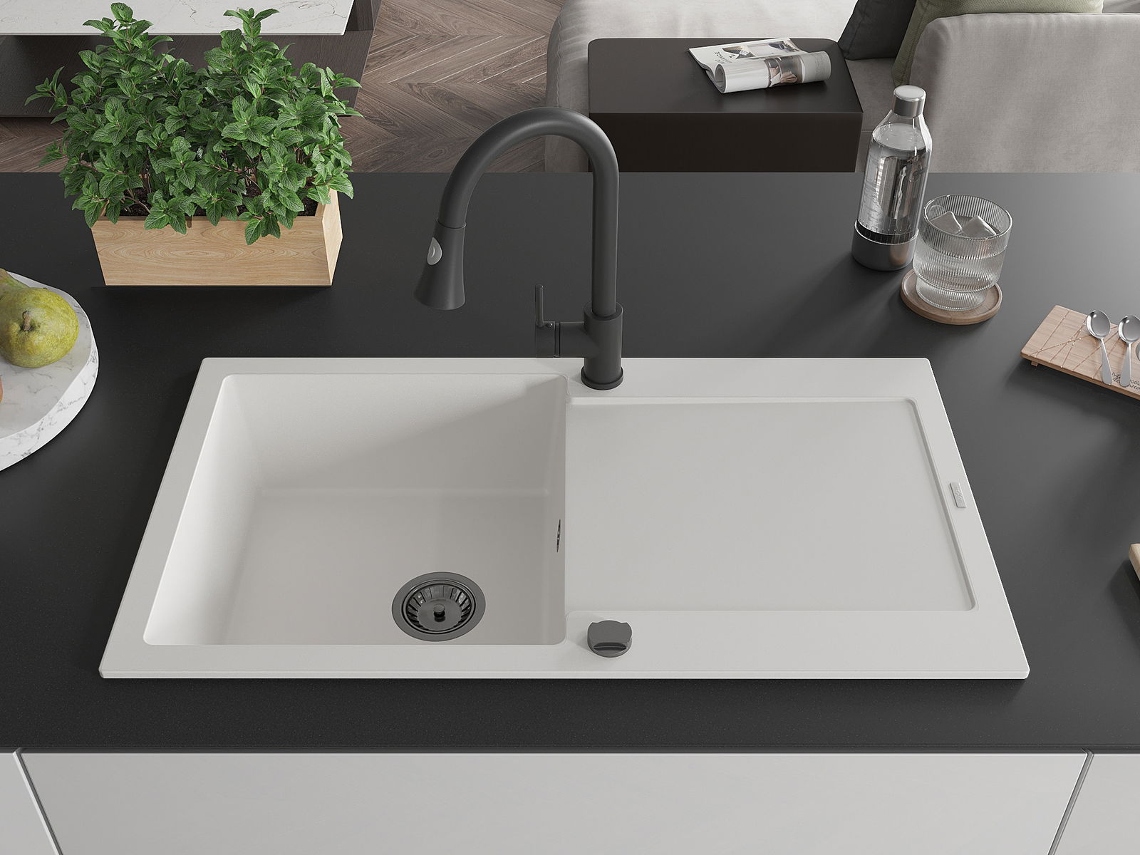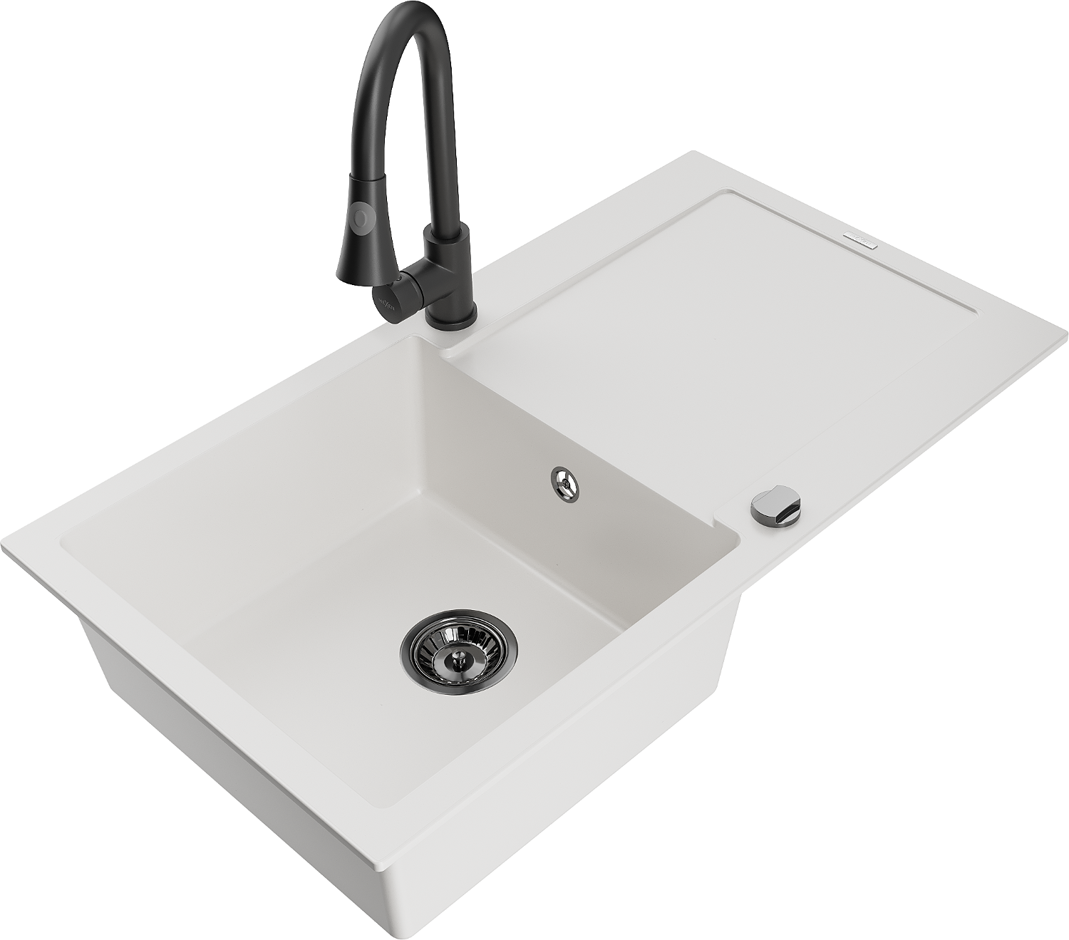 Mexen Leo zlewozmywak granitowy 1-komorowy z ociekaczem i baterią kuchenną Elia, biały - 6501-20-670101-70