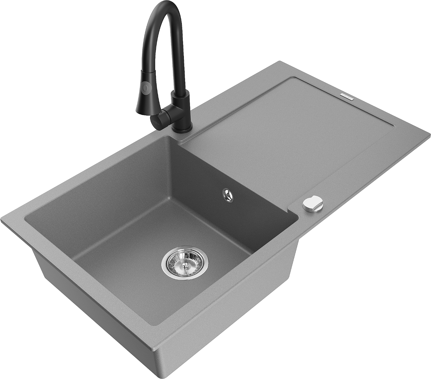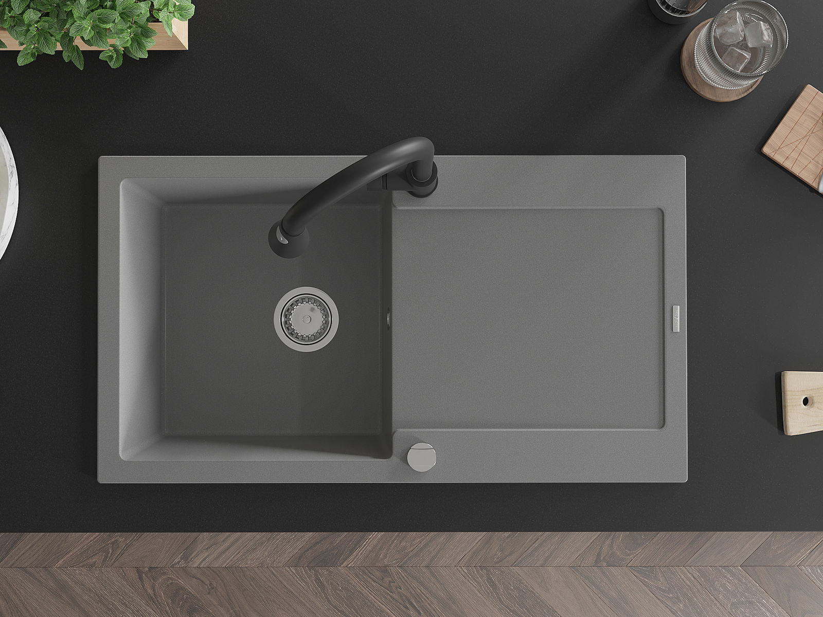 Mexen Leo zlewozmywak granitowy 1-komorowy z ociekaczem i baterią kuchenną Elia, szary - 6501-71-670101-70