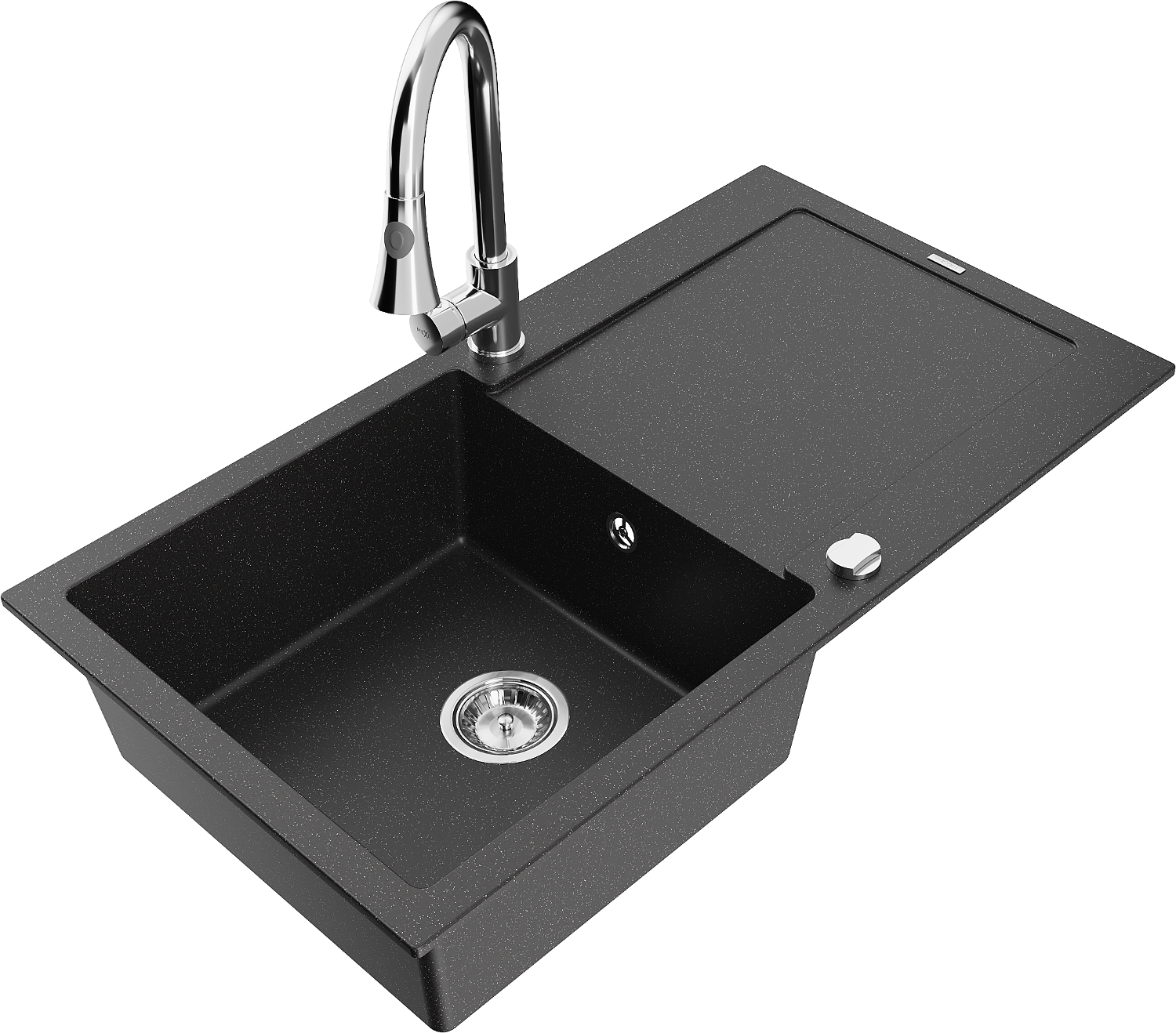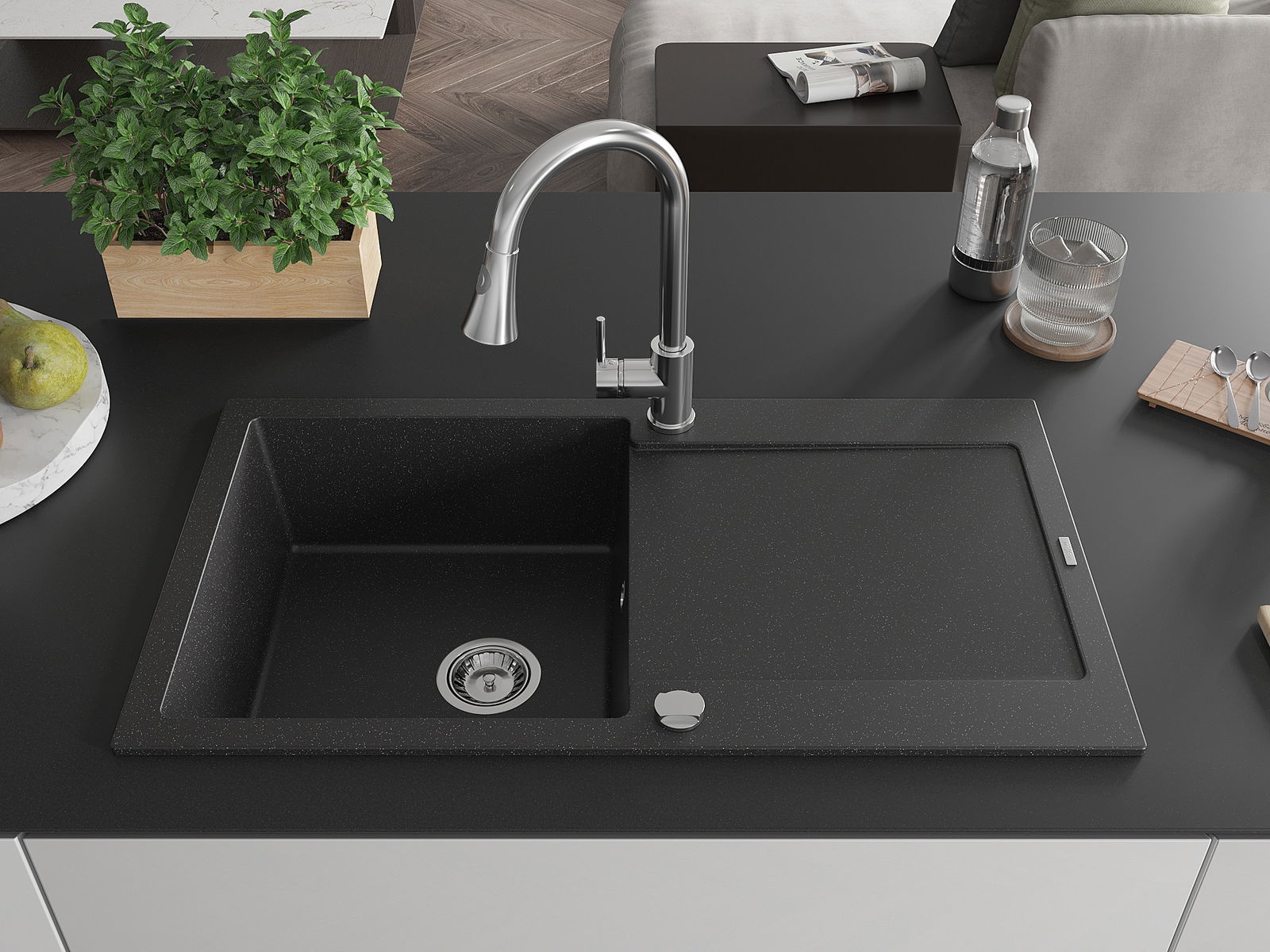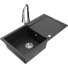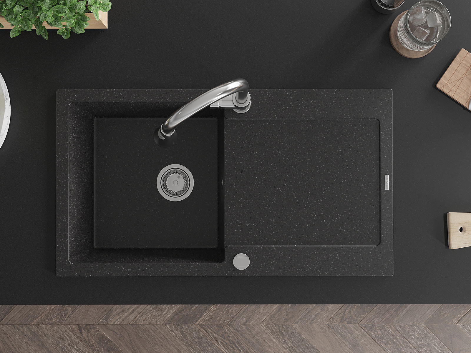 Mexen Leo zlewozmywak granitowy 1-komorowy z ociekaczem i baterią kuchenną Elia, czarny/srebrny metalik - 6501-73-670101-00
