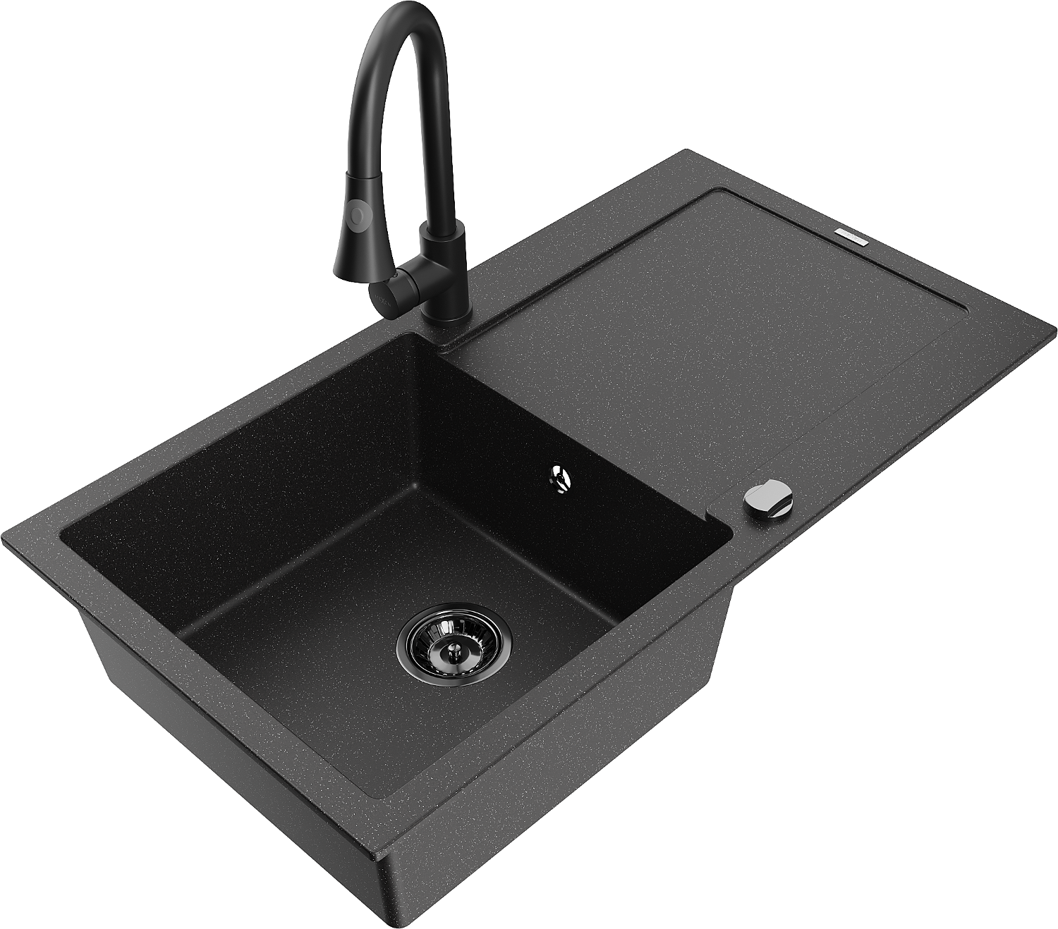 Mexen Leo zlewozmywak granitowy 1-komorowy z ociekaczem i baterią kuchenną Elia, czarny/srebrny metalik - 6501-73-670101-70-B