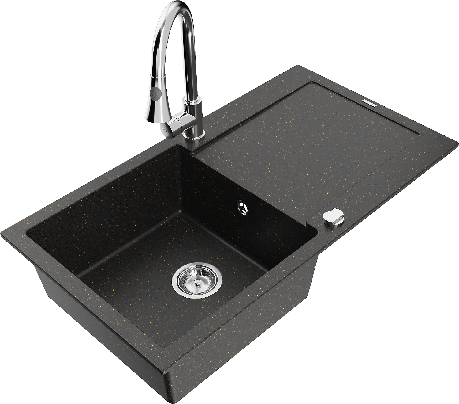 Mexen Leo zlewozmywak granitowy 1-komorowy z ociekaczem i baterią kuchenną Elia, czarny/złoty metalik - 6501-75-670101-00