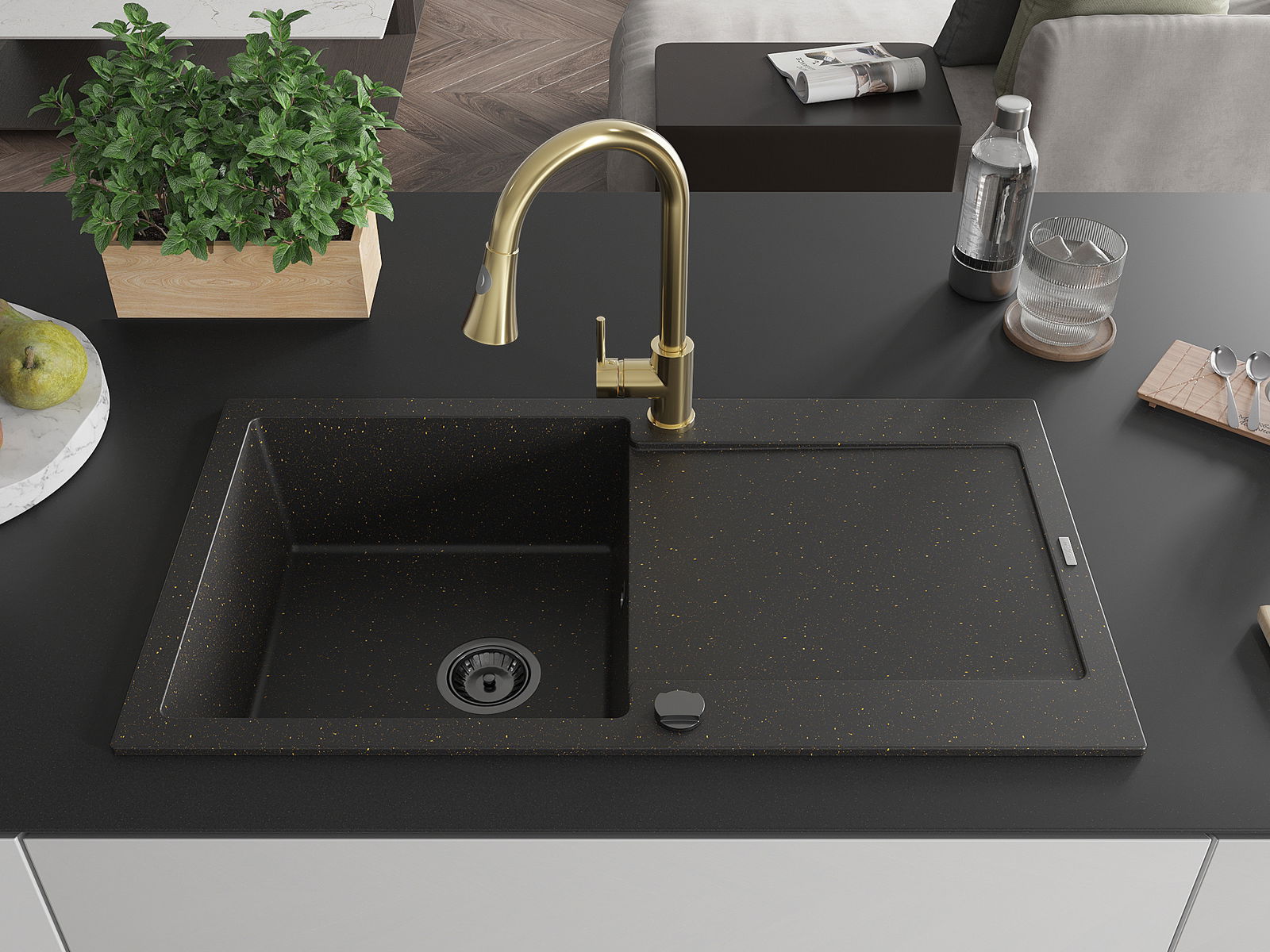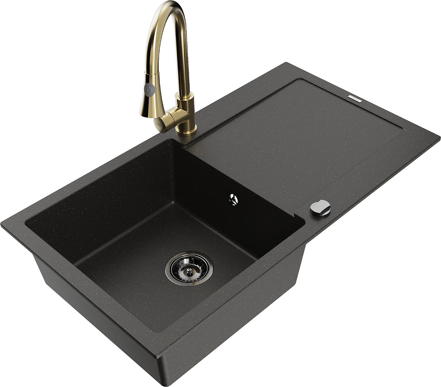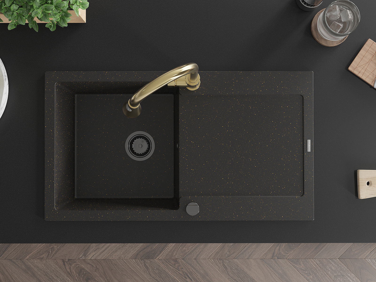 Mexen Leo zlewozmywak granitowy 1-komorowy z ociekaczem i baterią kuchenną Elia, czarny/złoty metalik - 6501-75-670101-50-B