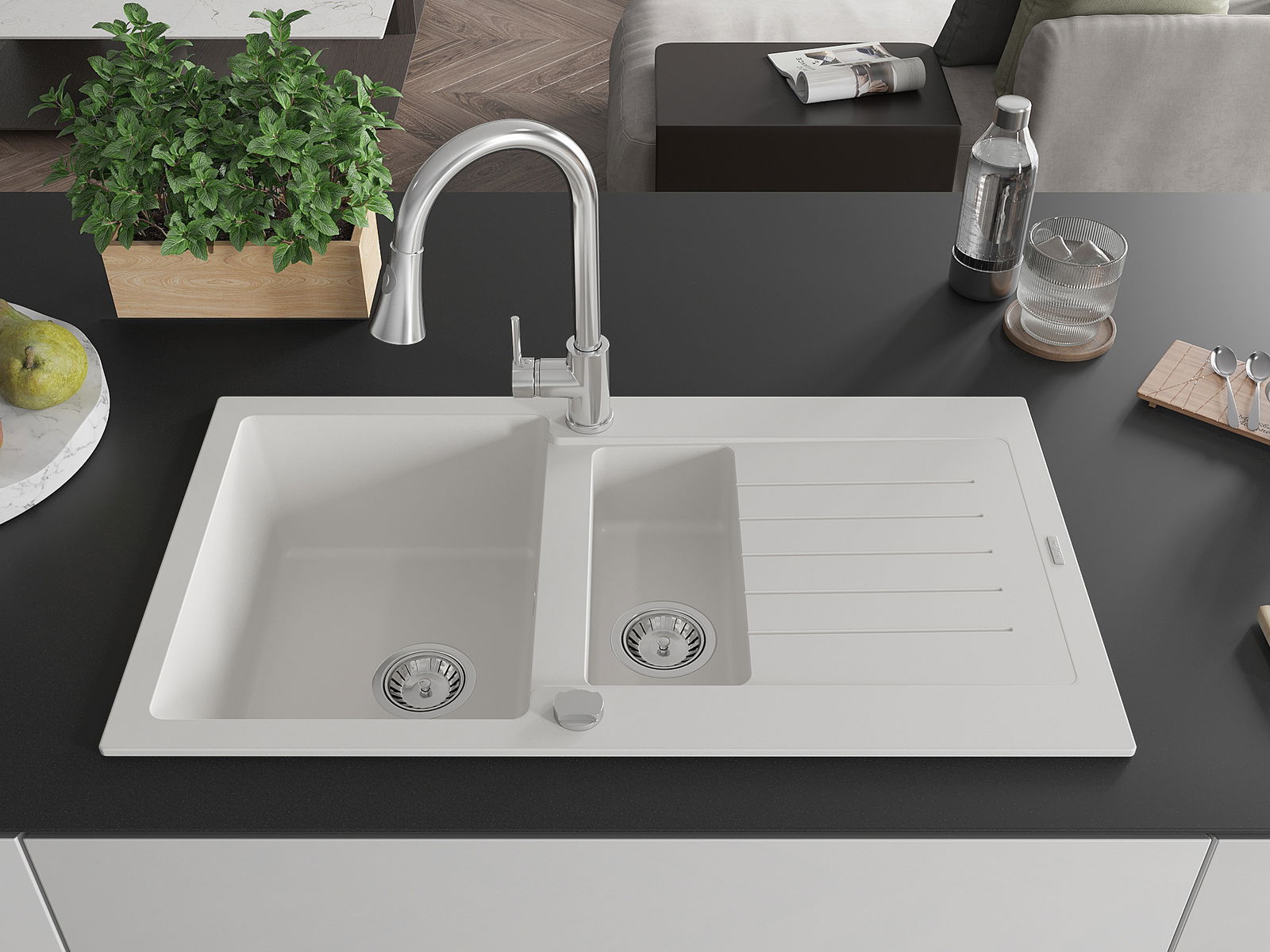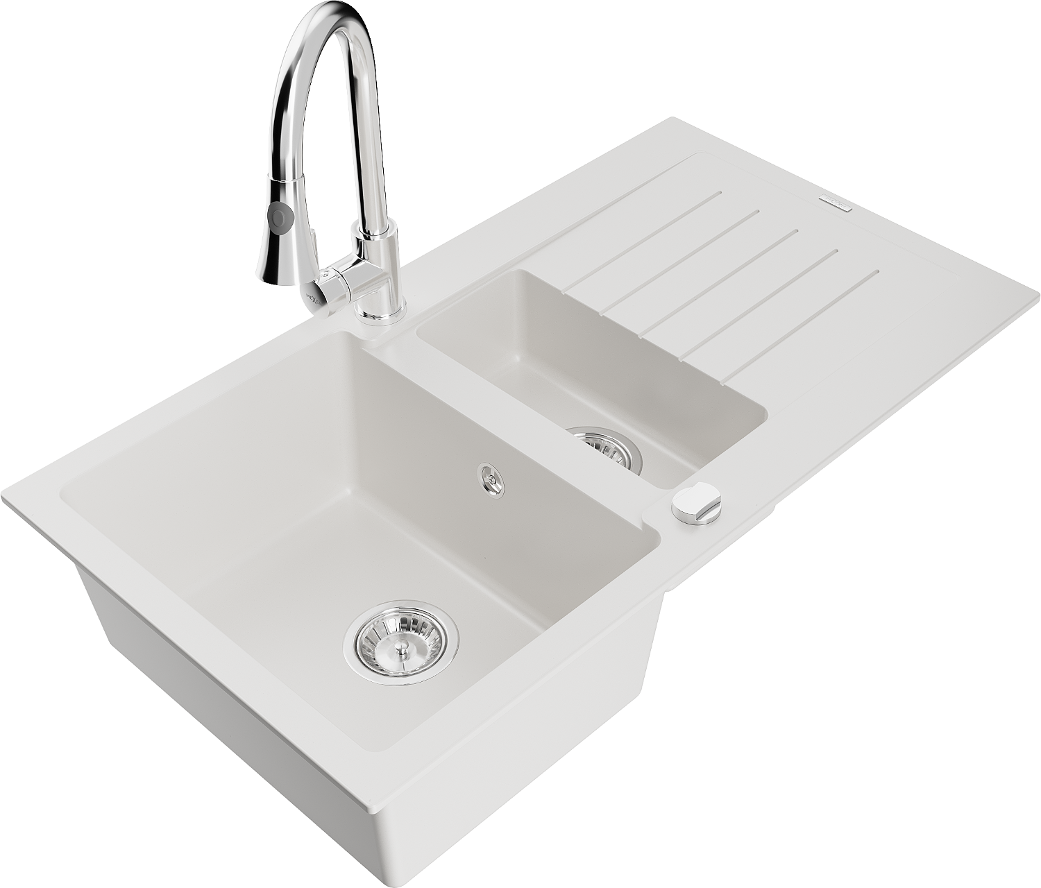 Mexen Matias zlewozmywak granitowy 1,5-komorowy z ociekaczem i baterią kuchenną Elia, biały - 6502-20-670101-00