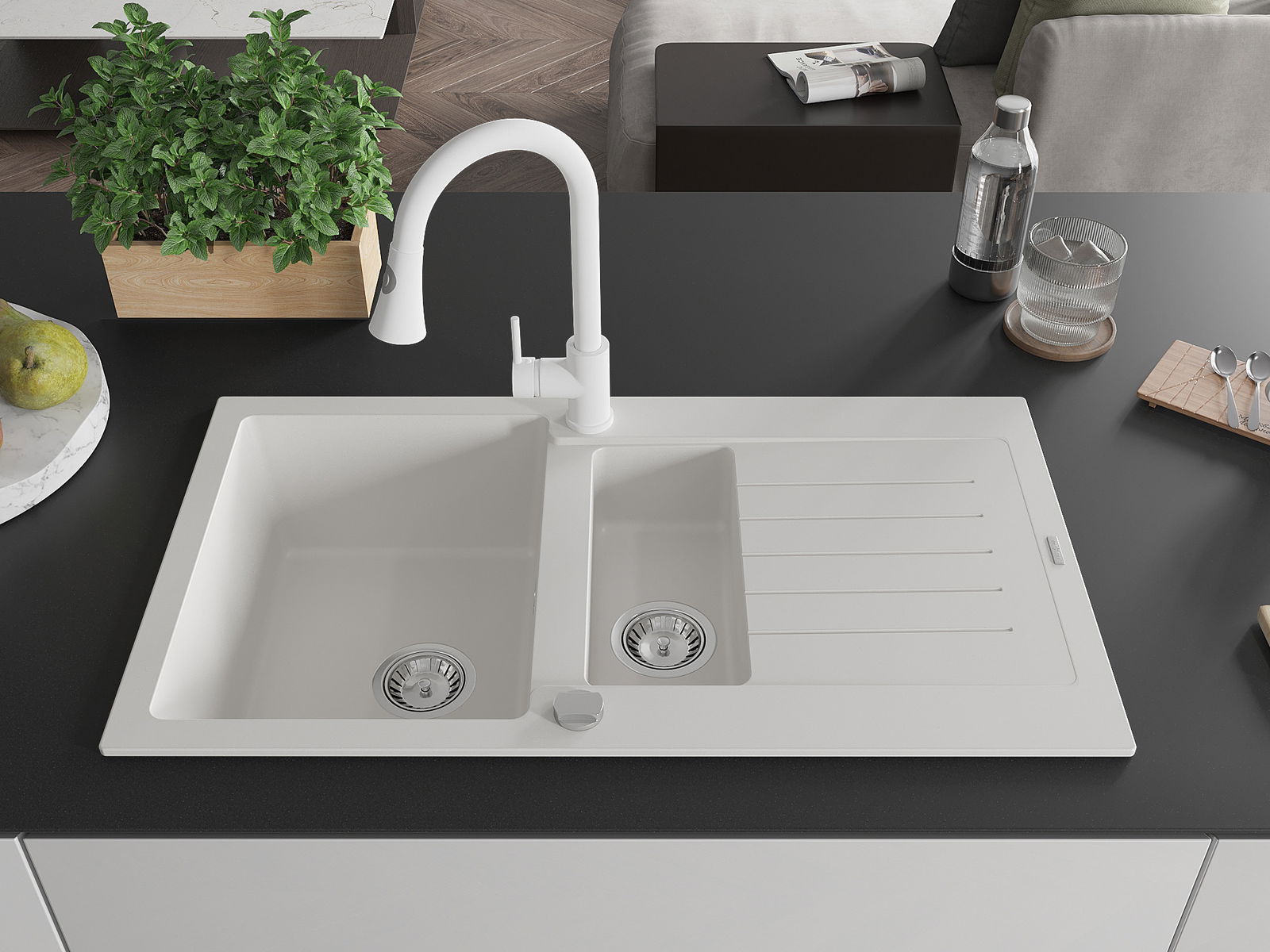 Mexen Matias zlewozmywak granitowy 1,5-komorowy z ociekaczem i baterią kuchenną Elia, biały - 6502-20-670101-20