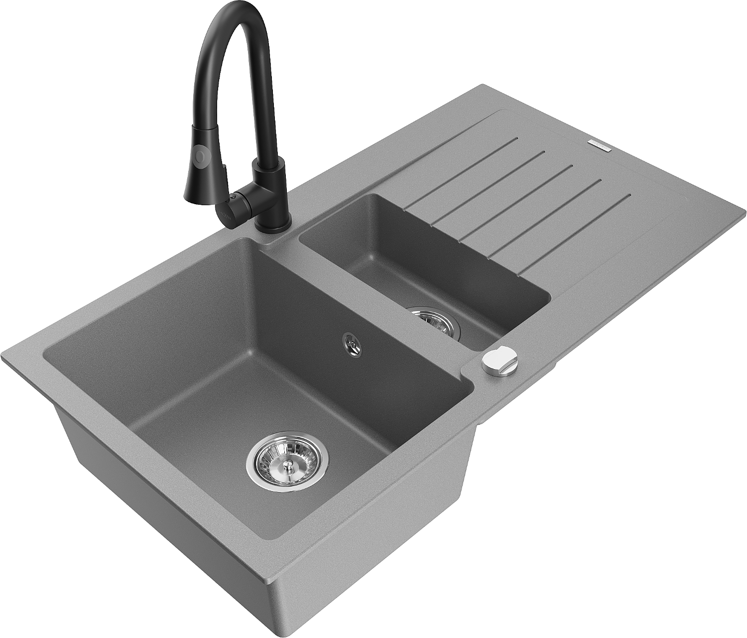 Mexen Matias zlewozmywak granitowy 1,5-komorowy z ociekaczem i baterią kuchenną Elia, szary - 6502-71-670101-70