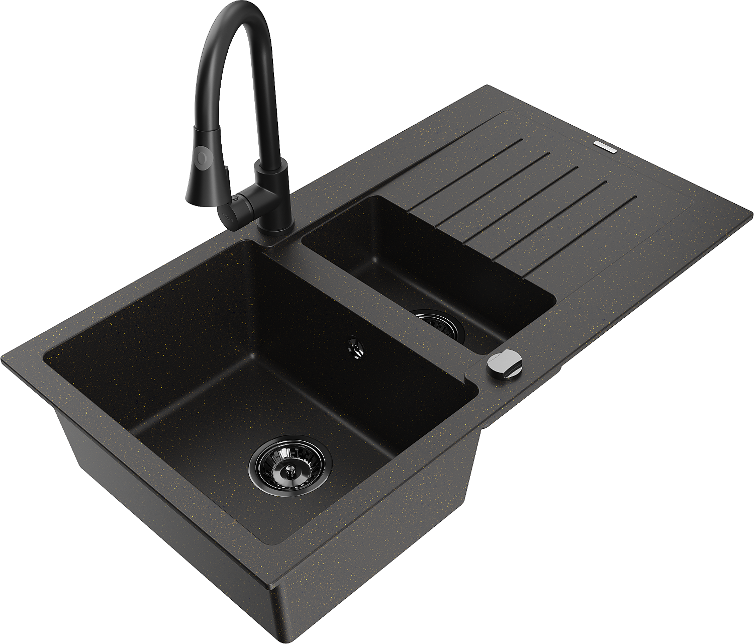 Mexen Matias zlewozmywak granitowy 1,5-komorowy z ociekaczem i baterią kuchenną Elia, czarny/złoty metalik - 6502-75-670101-70-B