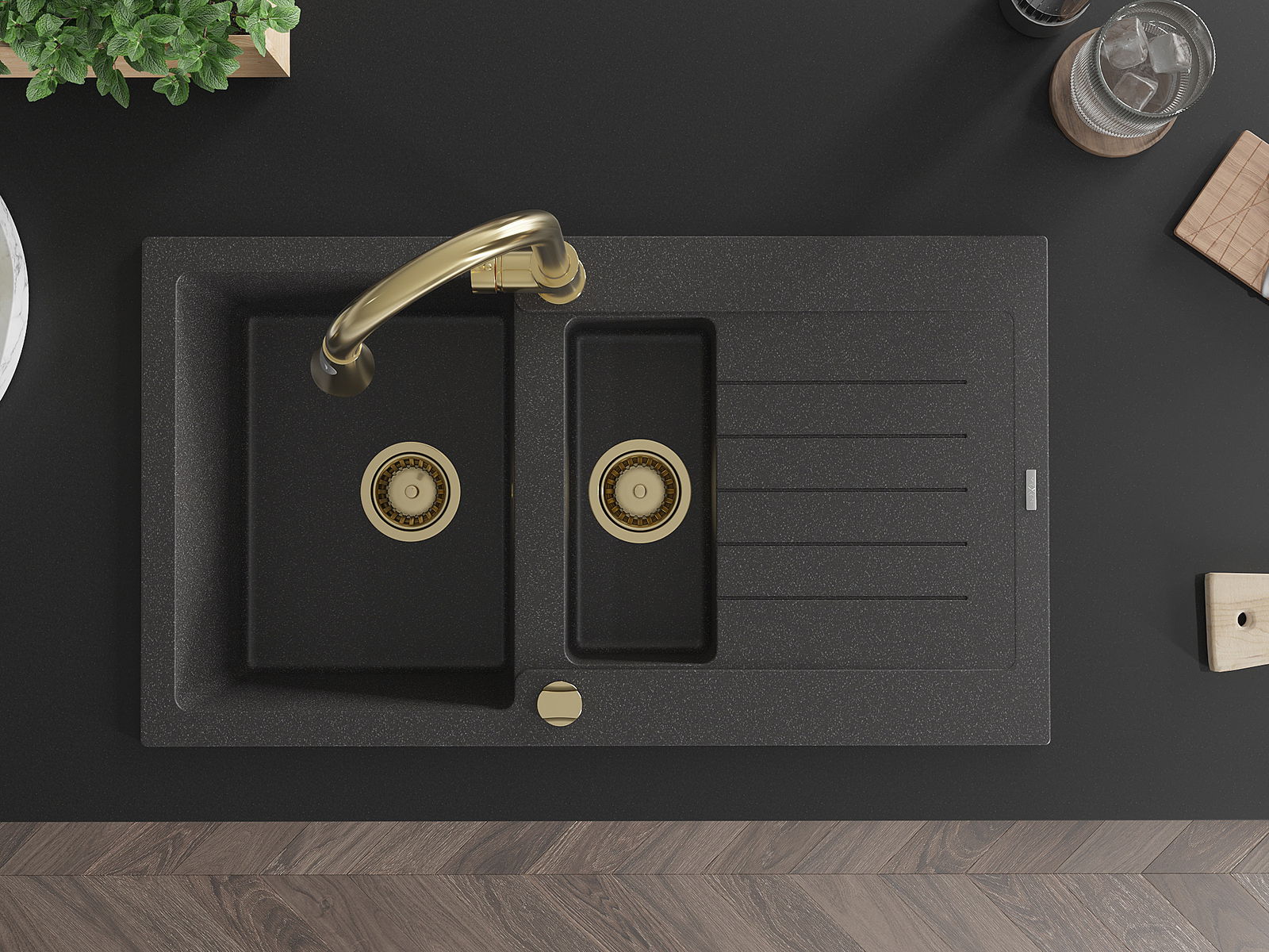Zlew posiada 2 podfrezowane otwory o średnicy 35 mm, do samodzielnego wybicia. Można je wykorzystać m.in. do montażu dozownika na płyn, który wyeliminuje obecność plastikowych butelek w kuchni i nada jej eleganckiego wykończenia.