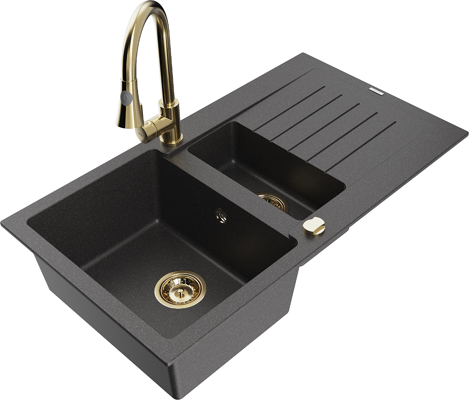 Mexen Matias zlewozmywak granitowy 1,5-komorowy z ociekaczem i baterią kuchenną Elia, czarny nakrapiany - 6502-76-670101-50