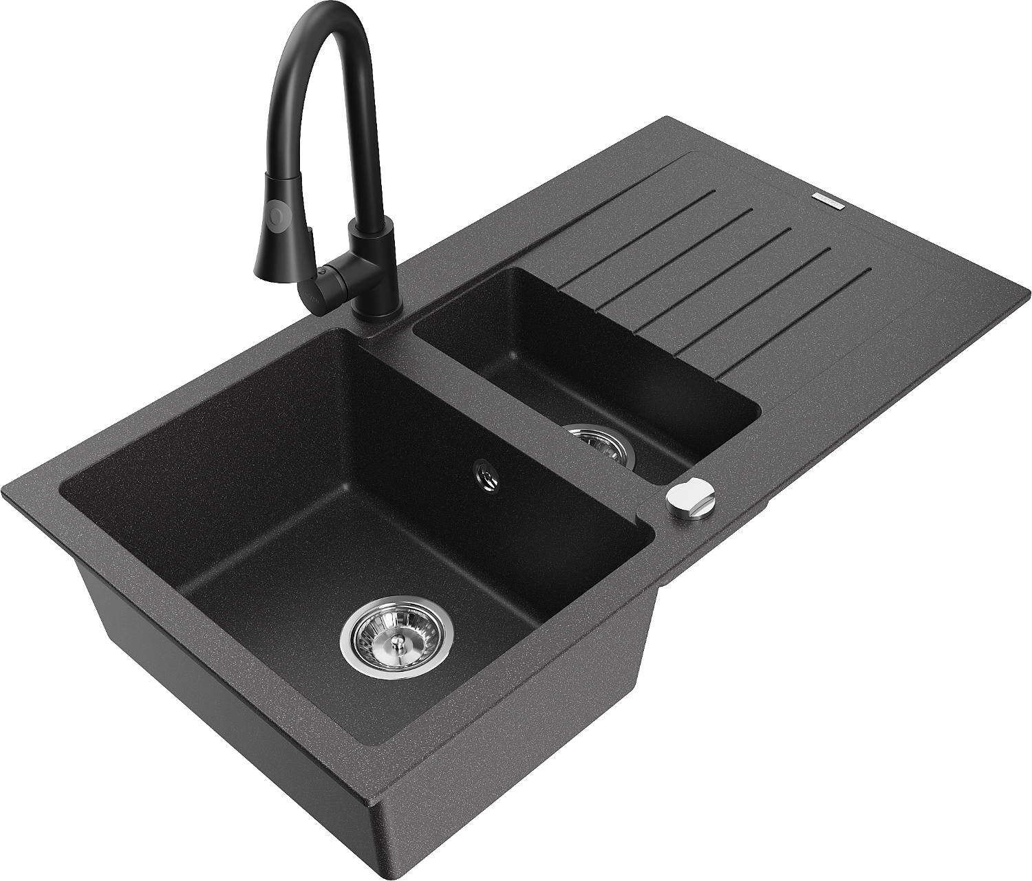 Mexen Matias zlewozmywak granitowy 1,5-komorowy z ociekaczem i baterią kuchenną Elia, czarny nakrapiany - 6502-76-670101-70