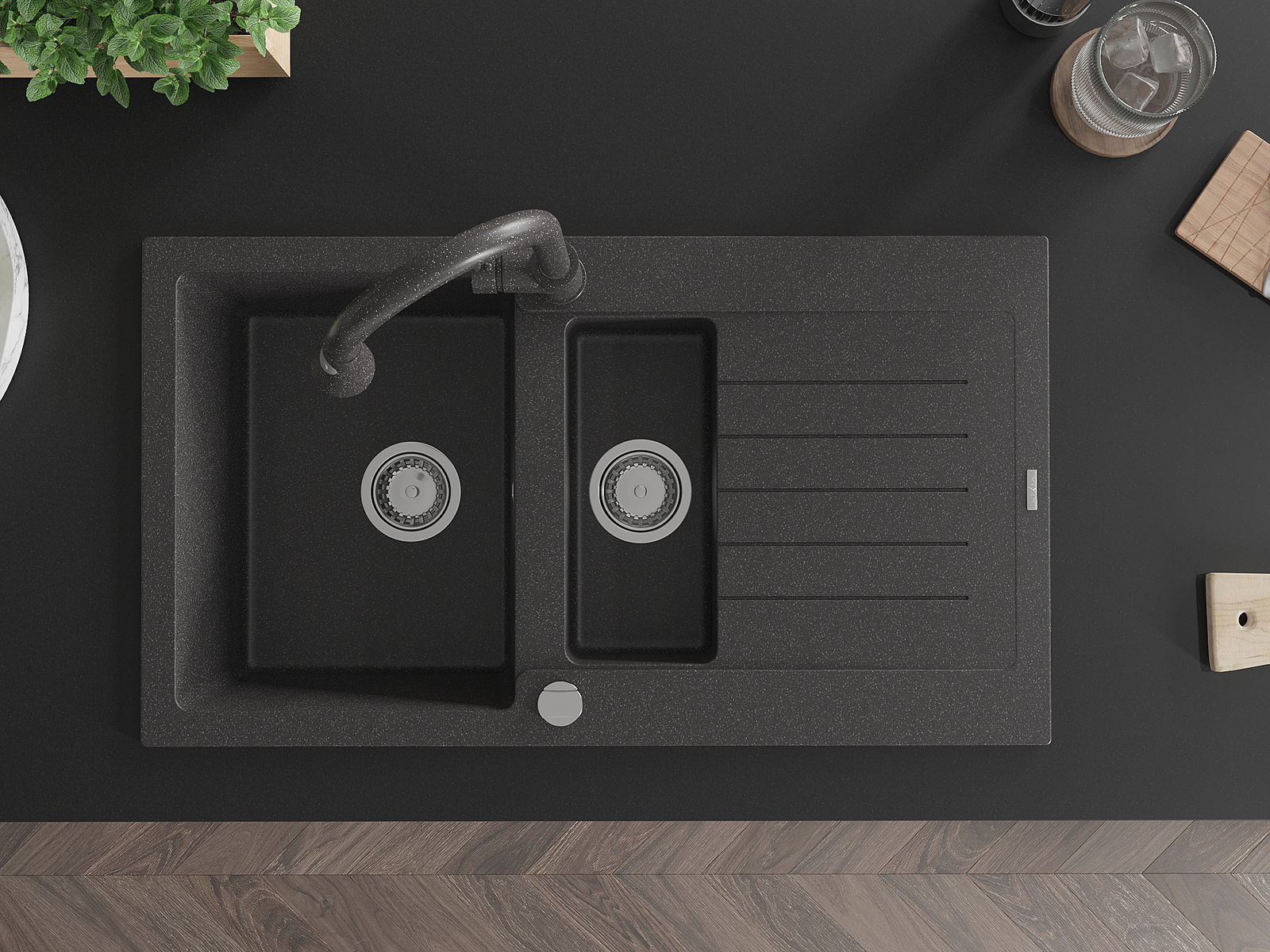 Dzięki zastosowaniu uniwersalnego systemu mocowania, zlew jest odwracalny, a ociekacz może zostać zamontowany na blacie po lewej lub prawej stronie. W ten sposób możesz z łatwością dopasować stronę do swoich potrzeb i warunków.