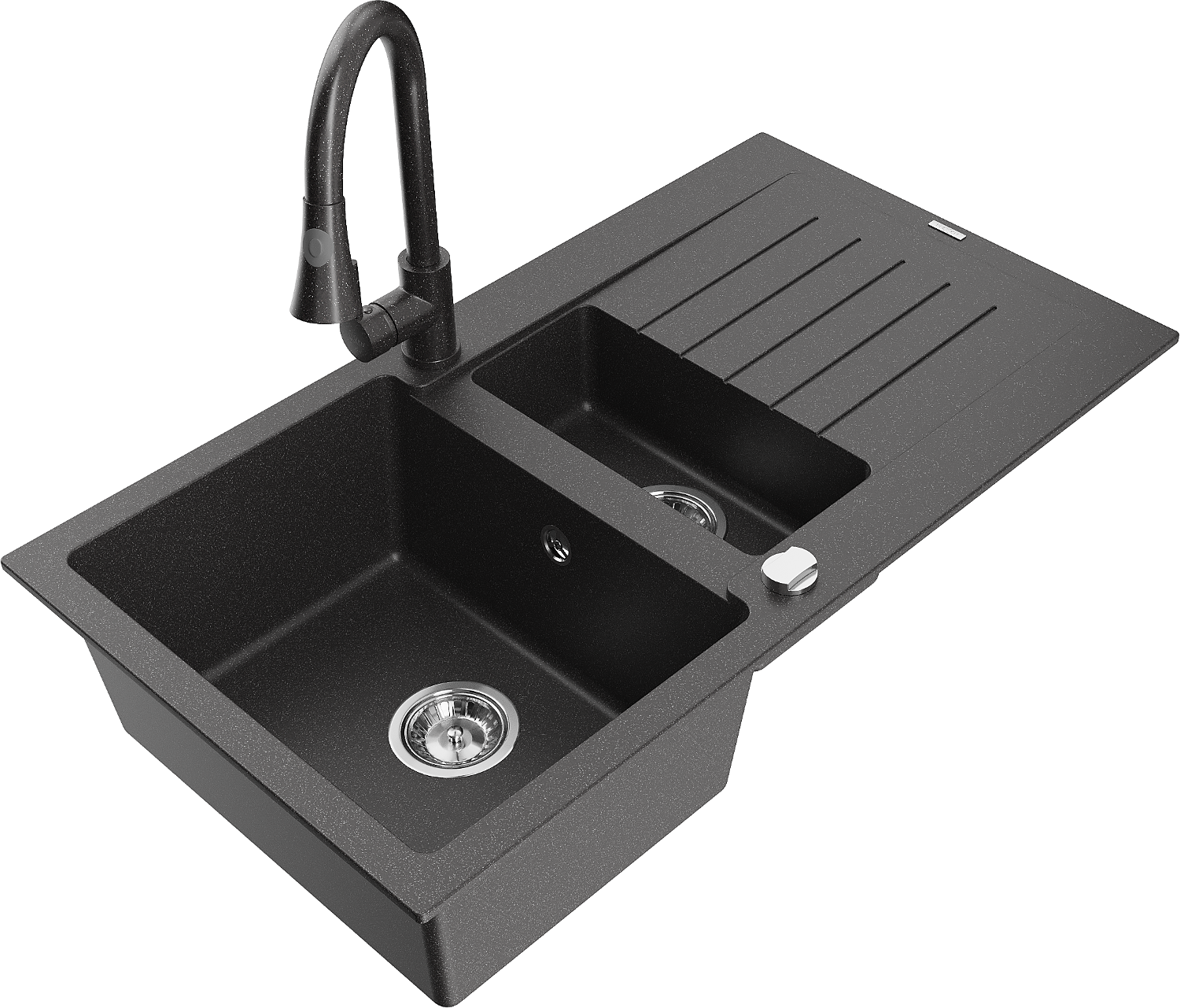 Mexen Matias zlewozmywak granitowy 1,5-komorowy z ociekaczem i baterią kuchenną Elia, czarny nakrapiany - 6502-76-670101-76