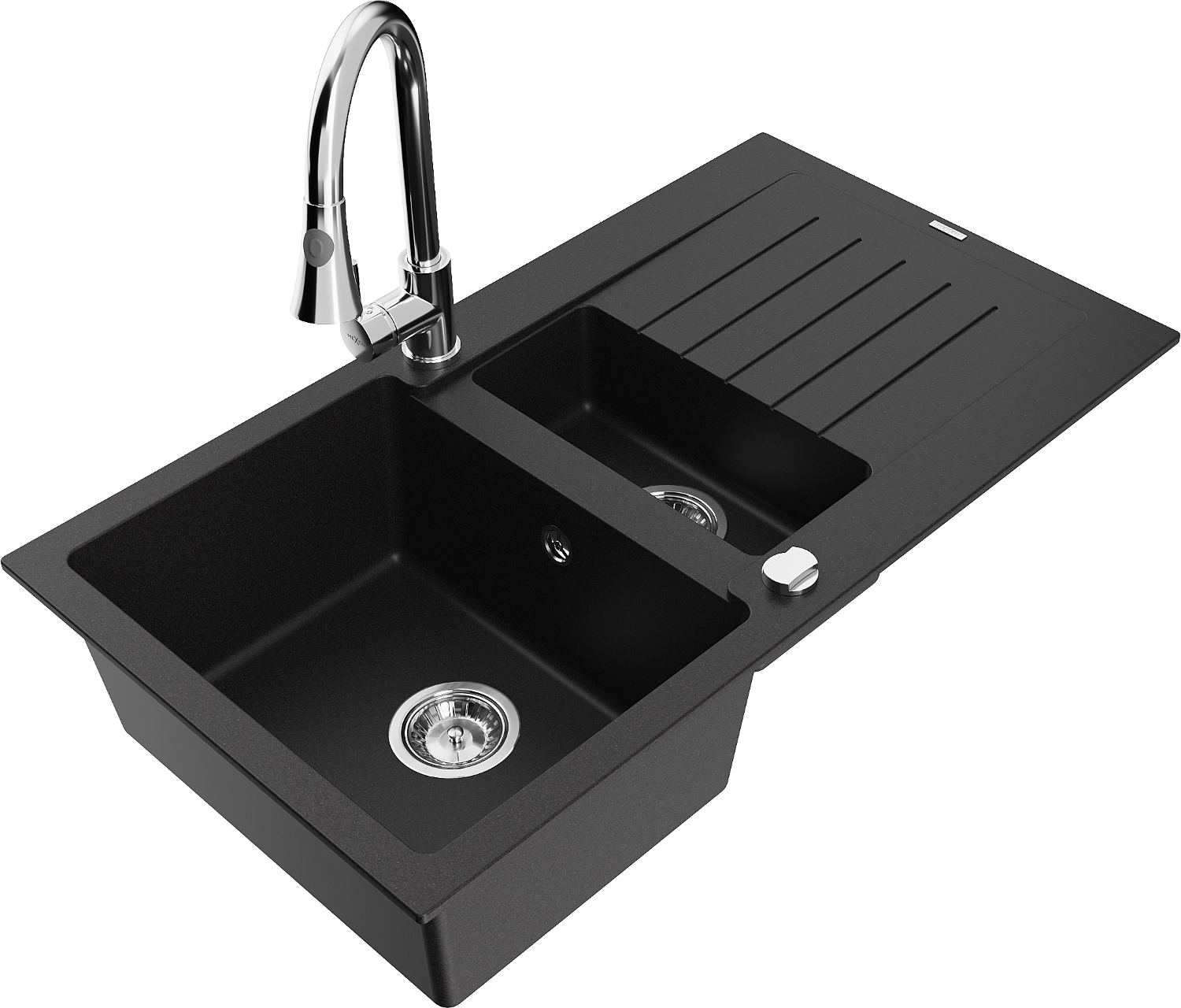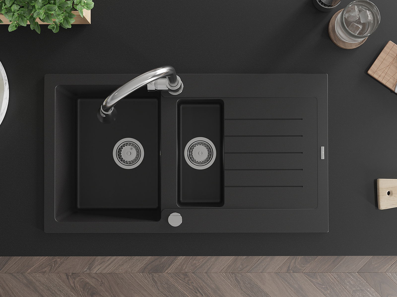 Mexen Matias zlewozmywak granitowy 1,5-komorowy z ociekaczem i baterią kuchenną Elia, czarny - 6502-77-670101-00