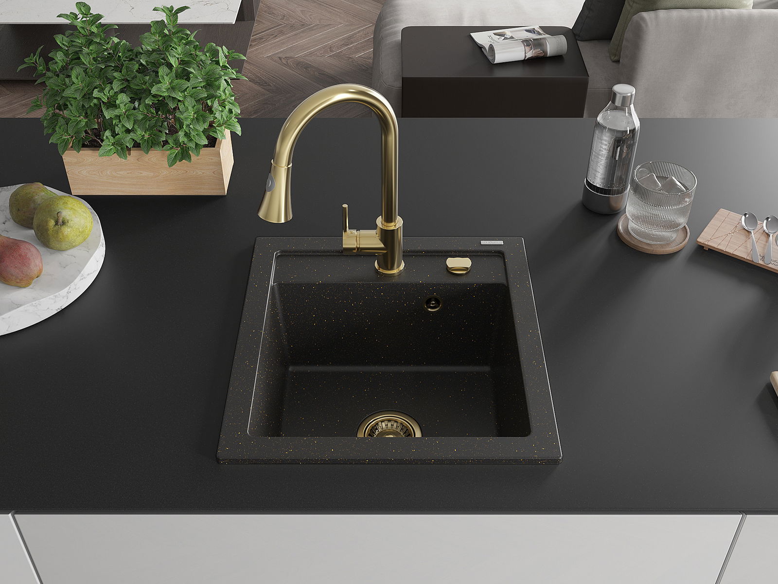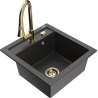 Mexen Vito zlewozmywak granitowy 1-komorowy z baterią kuchenną Elia, czarny/złoty metalik - 6503-75-670101-50