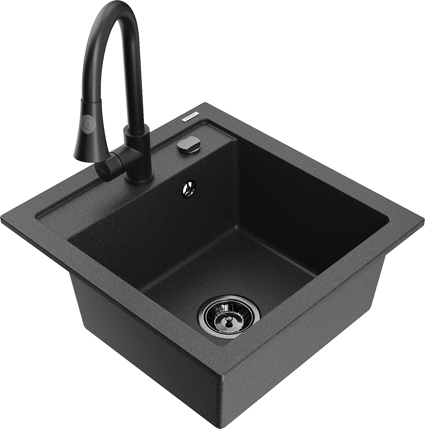 Mexen Vito zlewozmywak granitowy 1-komorowy z baterią kuchenną Elia, czarny nakrapiany - 6503-76-670101-70-B