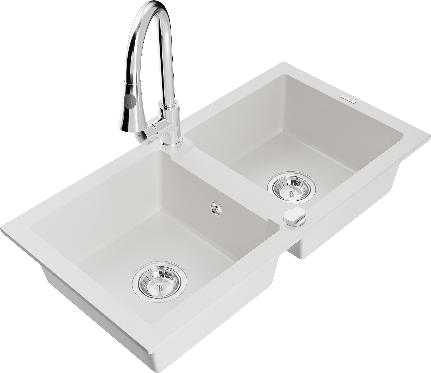 Mexen Mario zlewozmywak granitowy 2-komorowy z baterią kuchenną Elia, biały - 6504-20-670101-00