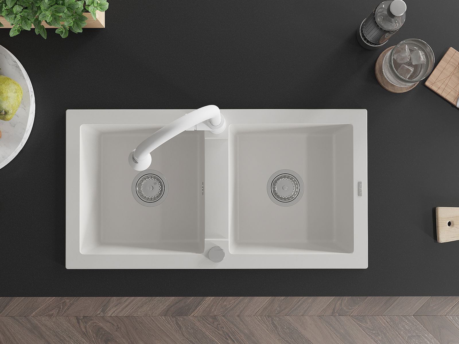 Mexen Mario zlewozmywak granitowy 2-komorowy z baterią kuchenną Elia, biały - 6504-20-670101-20