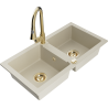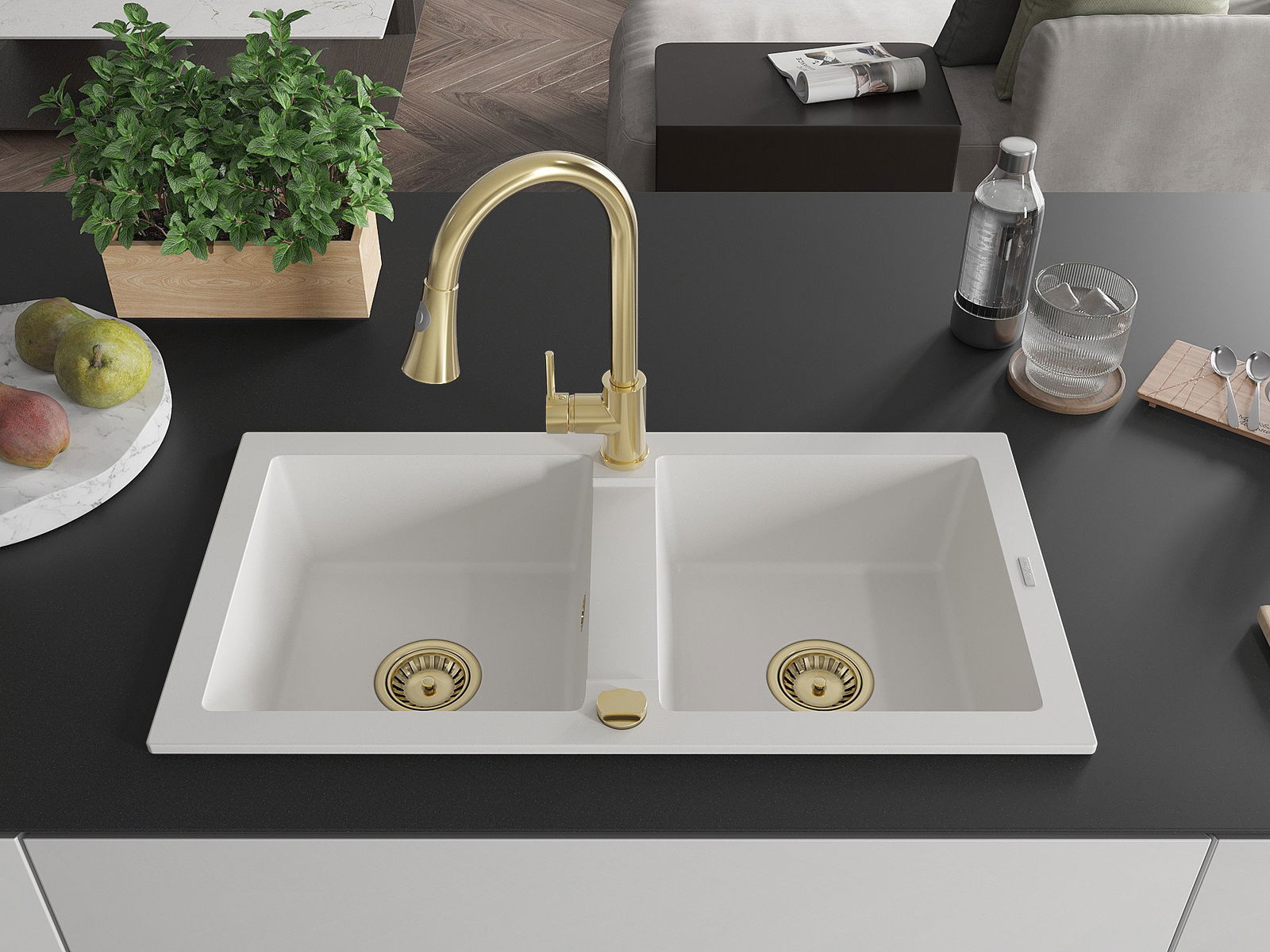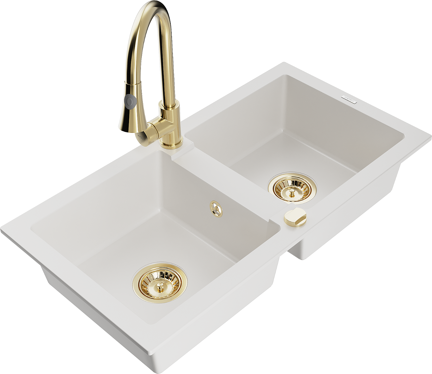 Mexen Mario zlewozmywak granitowy 2-komorowy z baterią kuchenną Elia, biały - 6504-20-670101-50