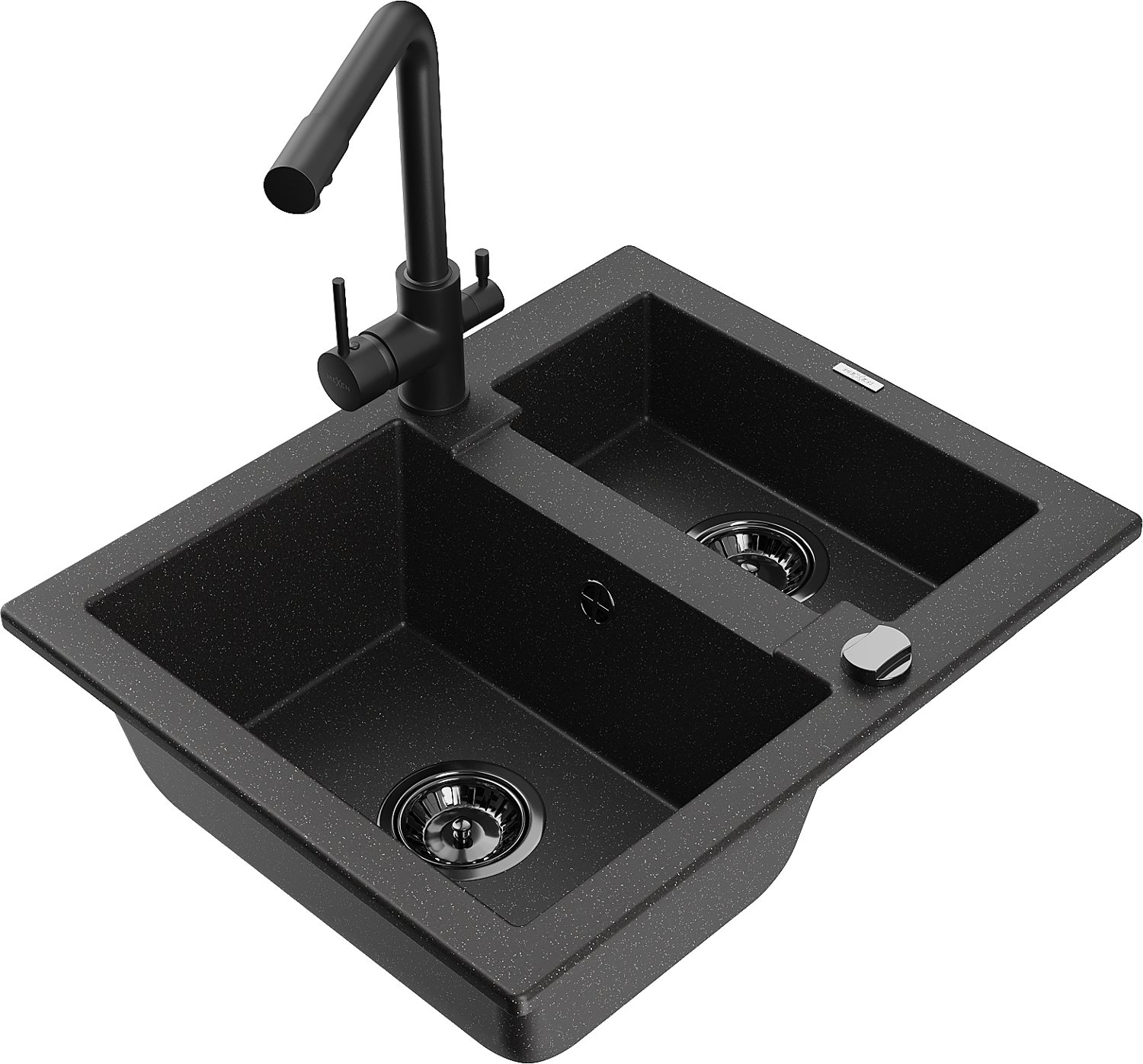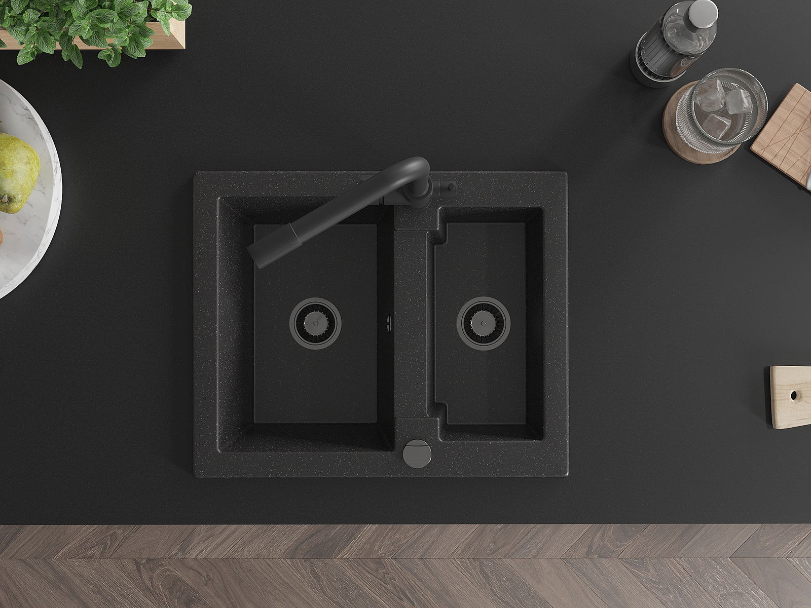 Mexen Carlos zlewozmywak granitowy 1,5-komorowy z baterią kuchenną Duero, czarny/srebrny metalik - 6518-73-671600-70-B