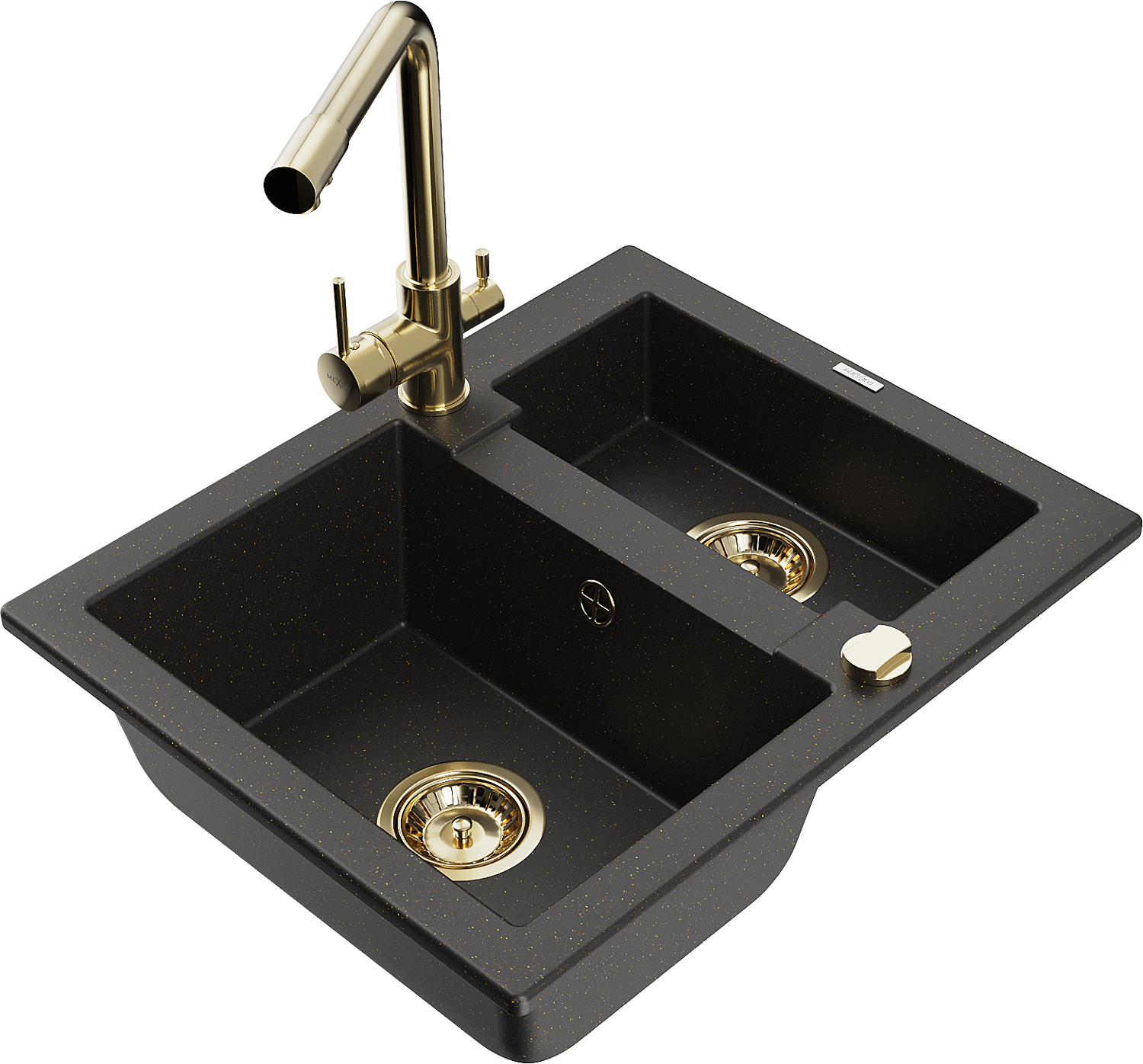 Mexen Carlos zlewozmywak granitowy 1,5-komorowy z baterią kuchenną Duero, czarny/złoty metalik - 6518-75-671600-50