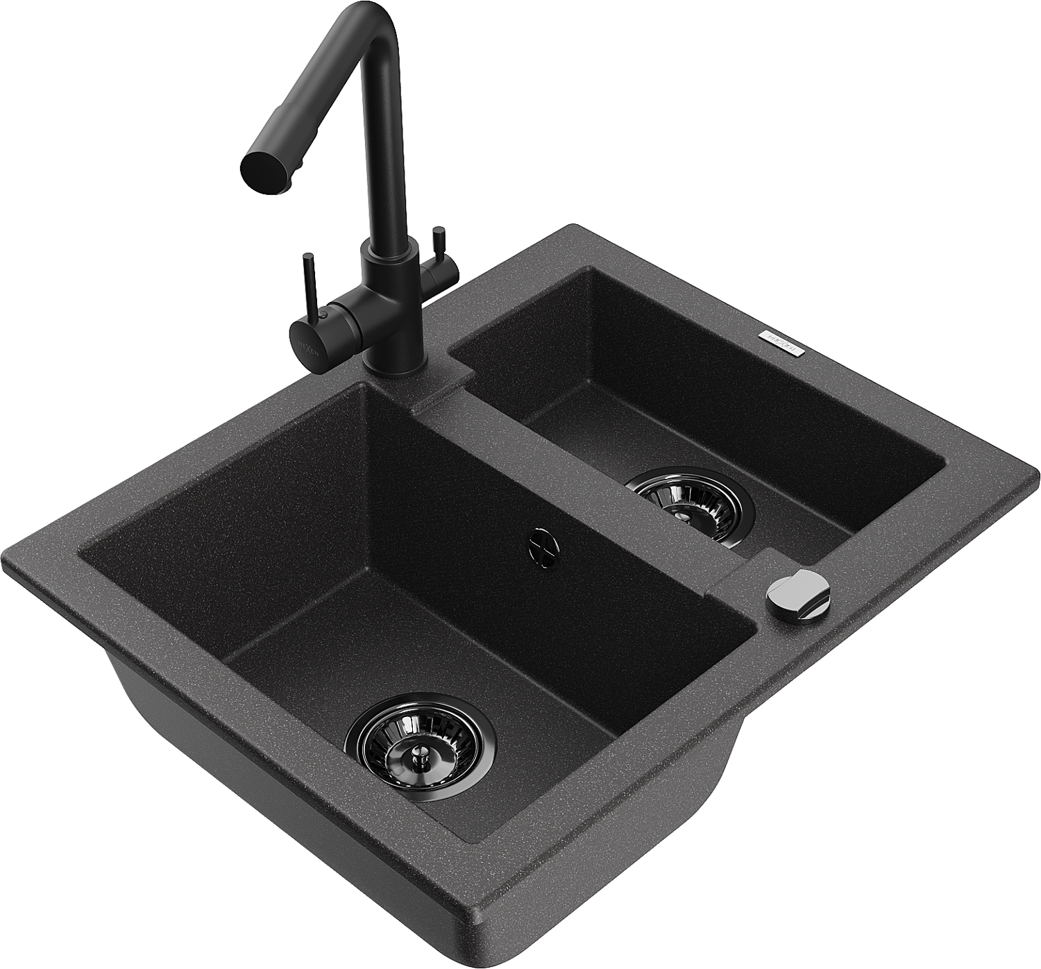 Mexen Carlos zlewozmywak granitowy 1,5-komorowy z baterią kuchenną Duero, czarny nakrapiany - 6518-76-671600-70-B