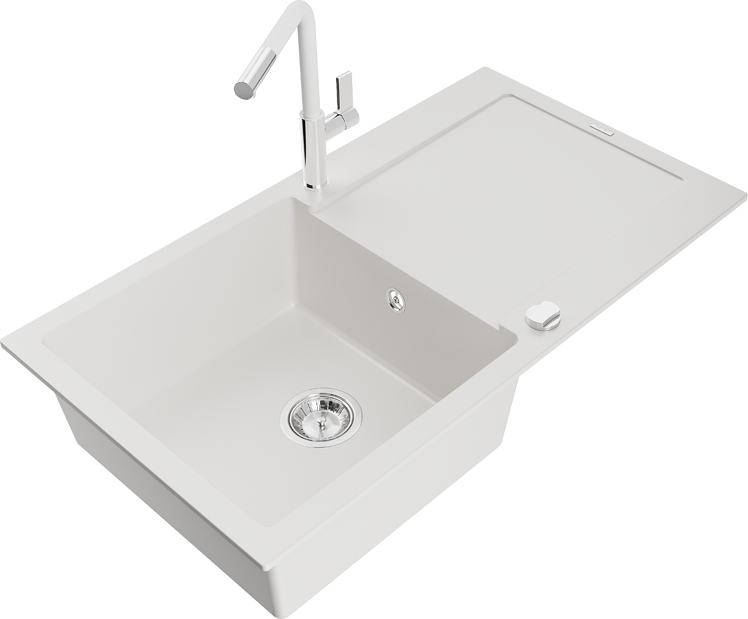 Mexen Leo zlewozmywak granitowy 1-komorowy z ociekaczem i baterią kuchenną Flora, biały - 6501-20-670401-02