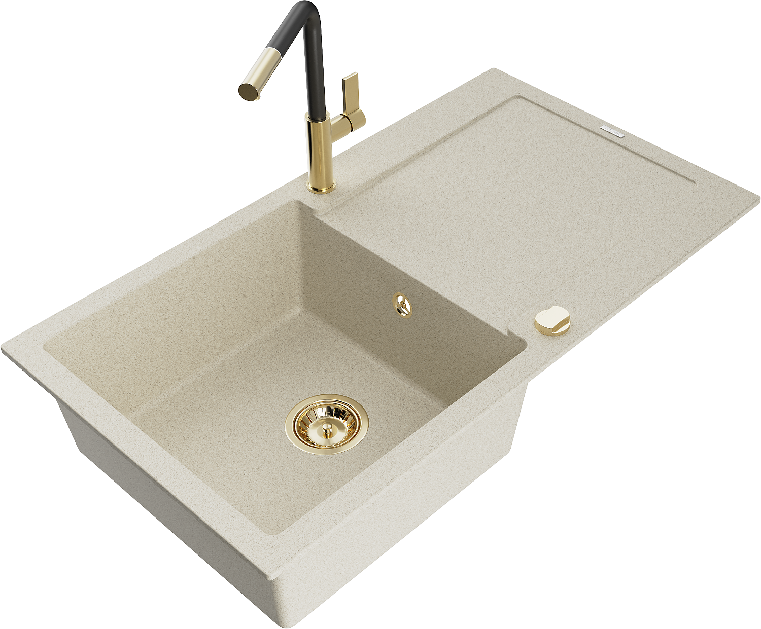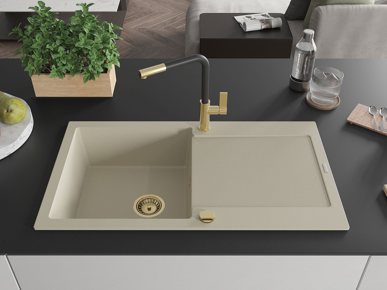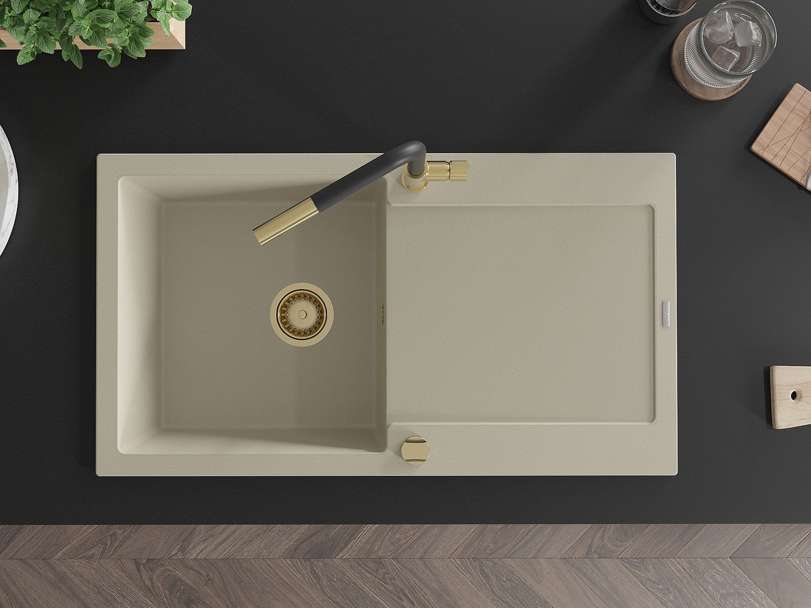 Mexen Leo zlewozmywak granitowy 1-komorowy z ociekaczem i baterią kuchenną Flora, beżowy - 6501-69-670401-57-G