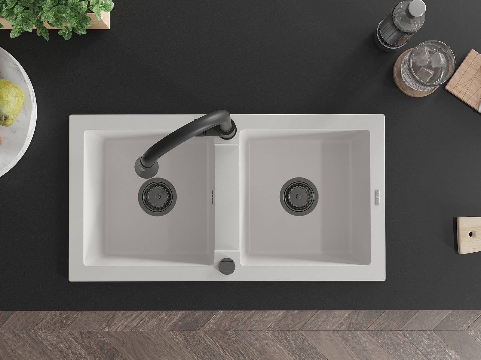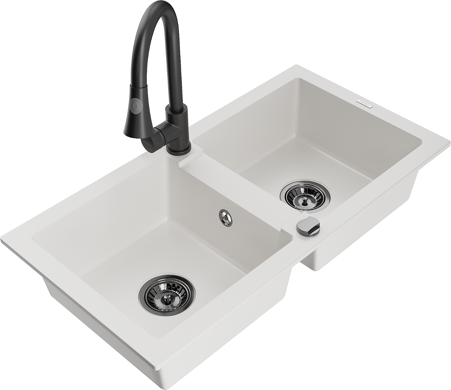 Mexen Mario zlewozmywak granitowy 2-komorowy z baterią kuchenną Elia, biały - 6504-20-670101-70