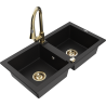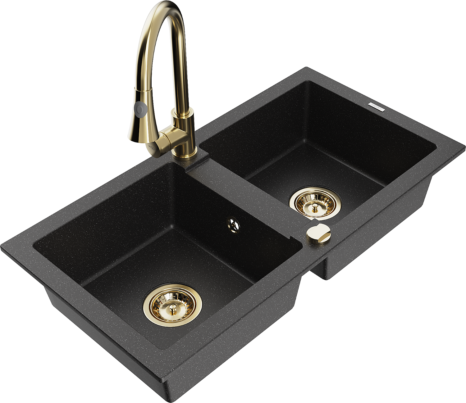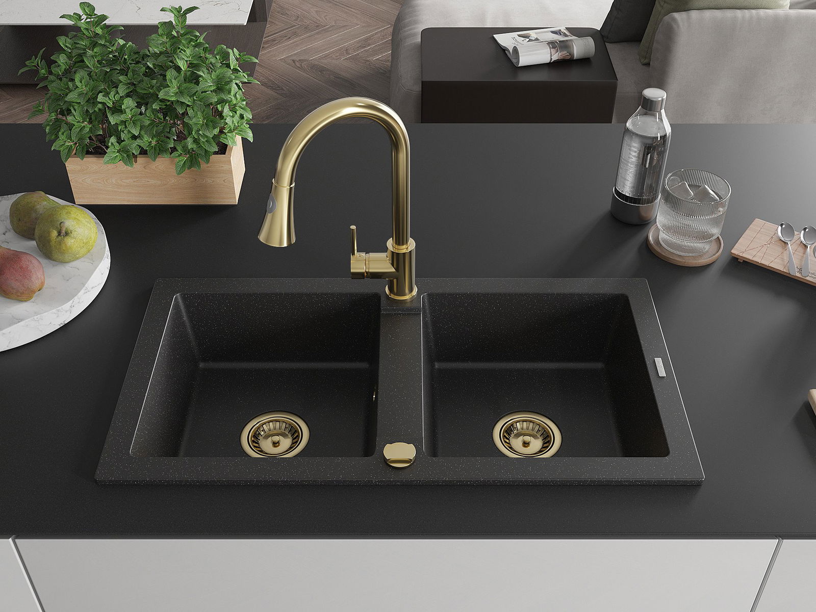 Mexen Mario zlewozmywak granitowy 2-komorowy z baterią kuchenną Elia, czarny/srebrny metalik - 6504-73-670101-50