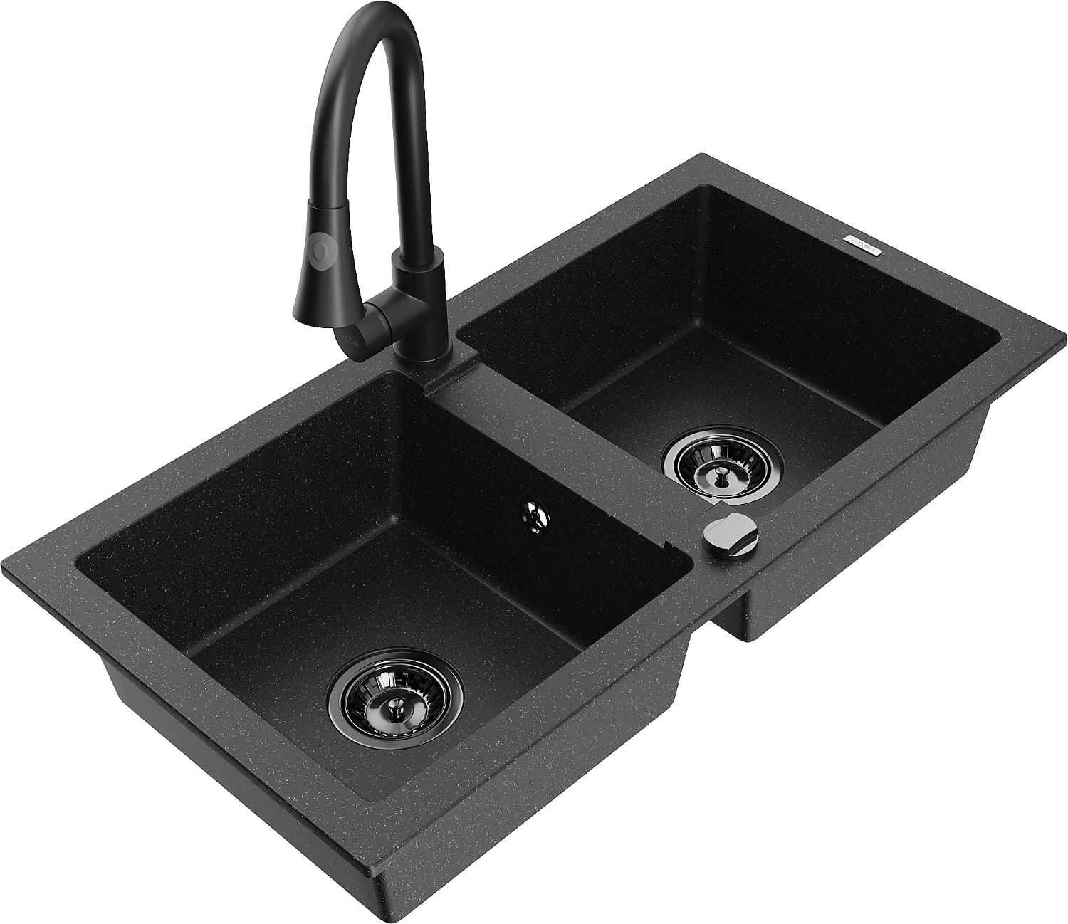 Mexen Mario zlewozmywak granitowy 2-komorowy z baterią kuchenną Elia, czarny/srebrny metalik - 6504-73-670101-70-B