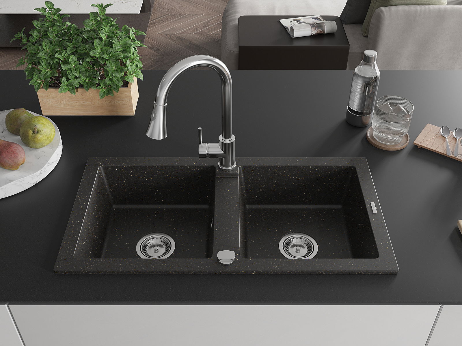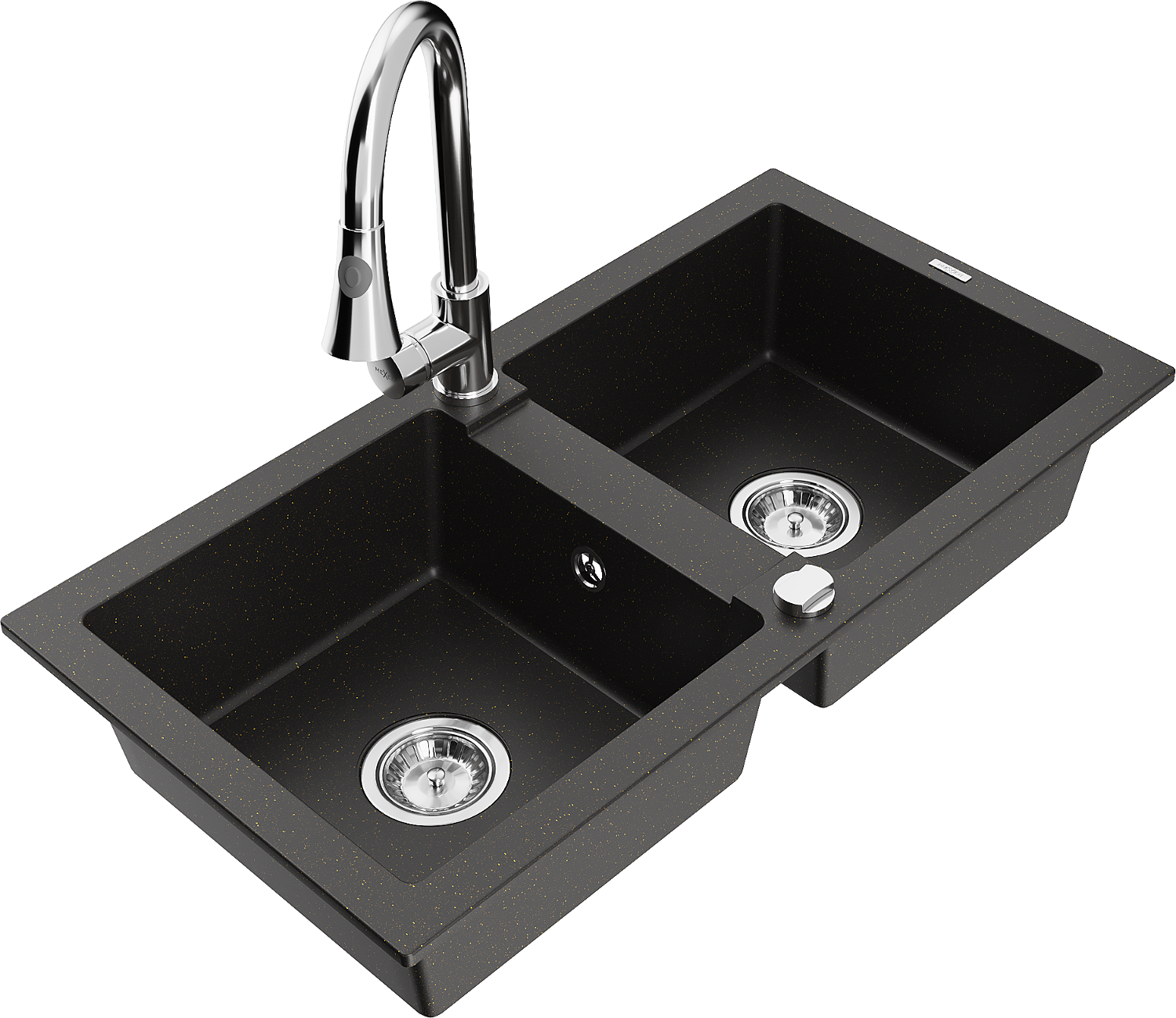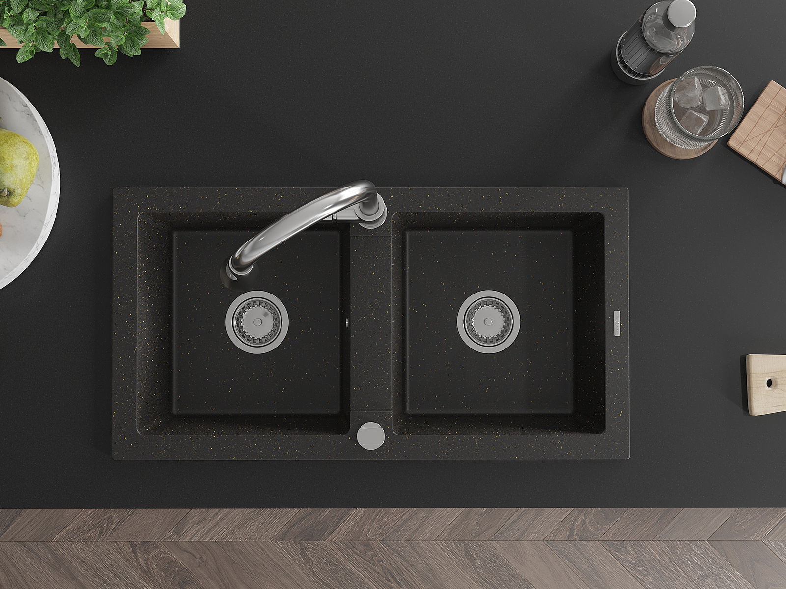Mexen Mario zlewozmywak granitowy 2-komorowy z baterią kuchenną Elia, czarny/złoty metalik - 6504-75-670101-00