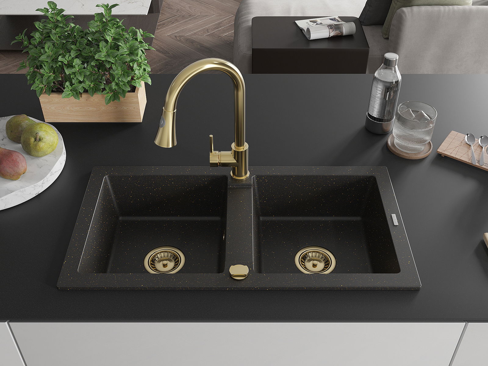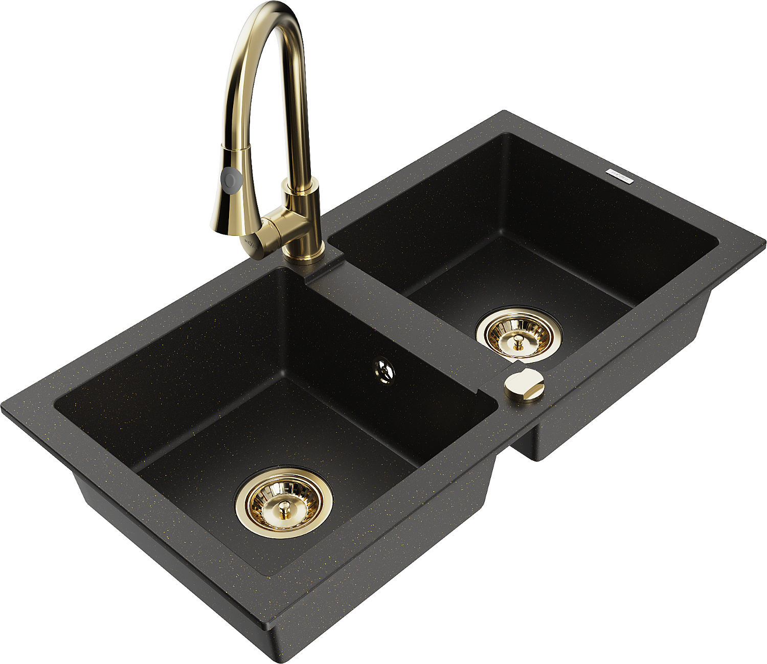 Mexen Mario zlewozmywak granitowy 2-komorowy z baterią kuchenną Elia, czarny/złoty metalik - 6504-75-670101-50