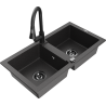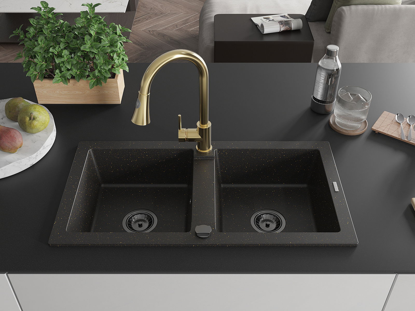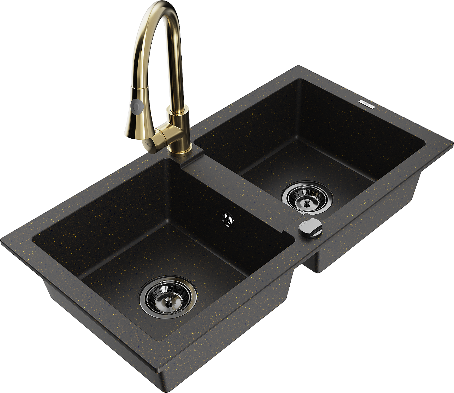 Mexen Mario zlewozmywak granitowy 2-komorowy z baterią kuchenną Elia, czarny/złoty metalik - 6504-75-670101-50-B